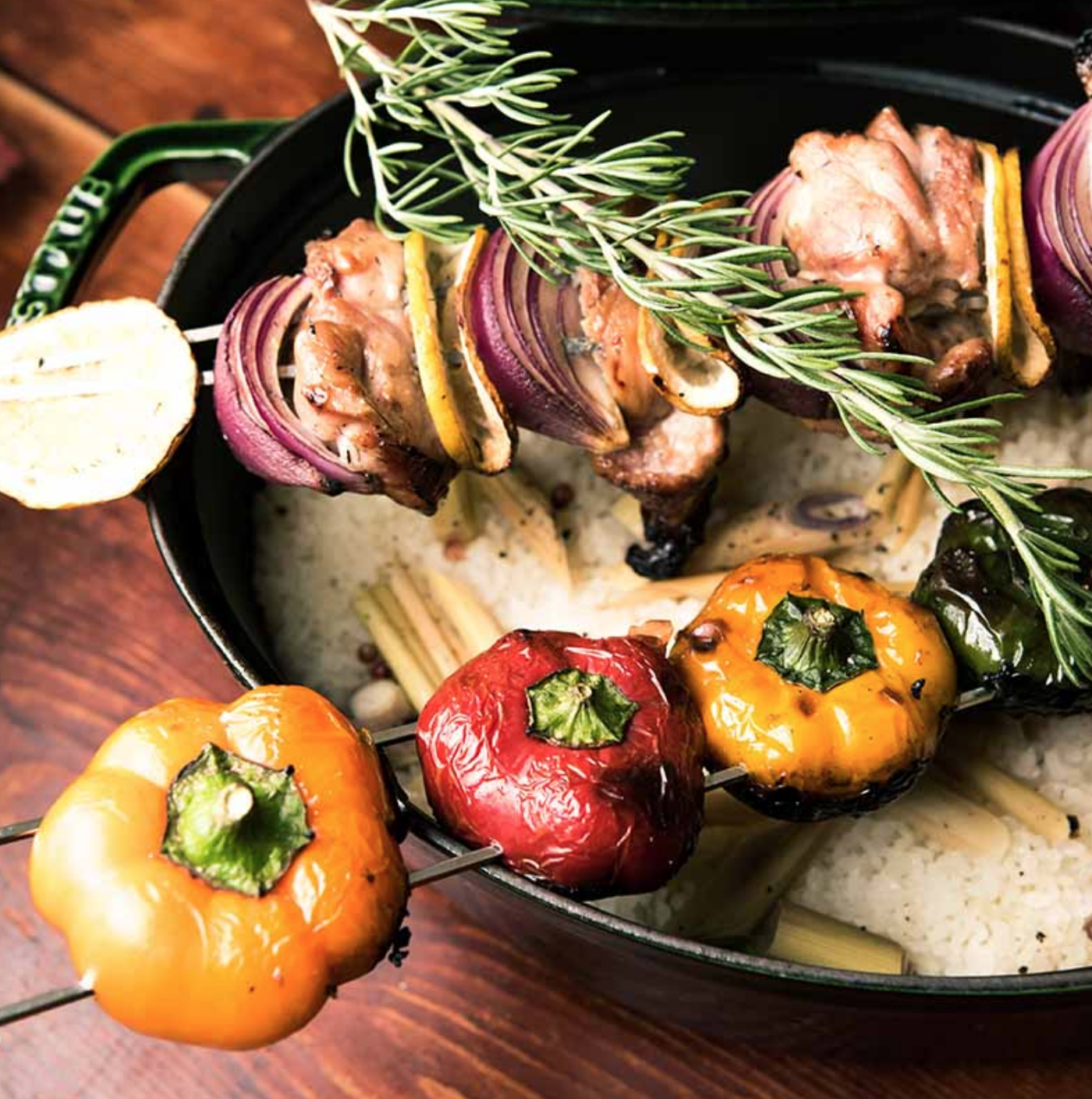 这款菜我们平时也比较常见,肉类通常会选用鸡肉和海鲜。在家中提前腌制好,尽量切成大块,这样才有吃烤肉的爽感。选择蔬菜时尽量以颜色鲜艳的为主,比如彩椒、洋葱、小番茄等。因为这个料理人人都会做,所以如何在颜色搭配上做的好看则非常重要。其次蔬菜在烧烤前最好可以在水中泡一下,防止迅速变糊。
