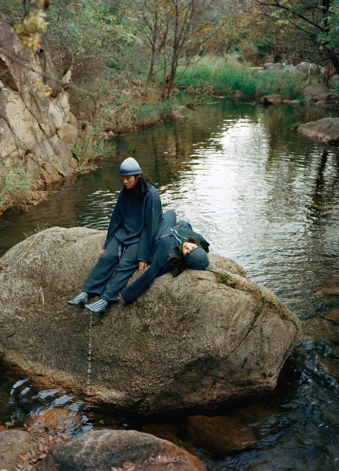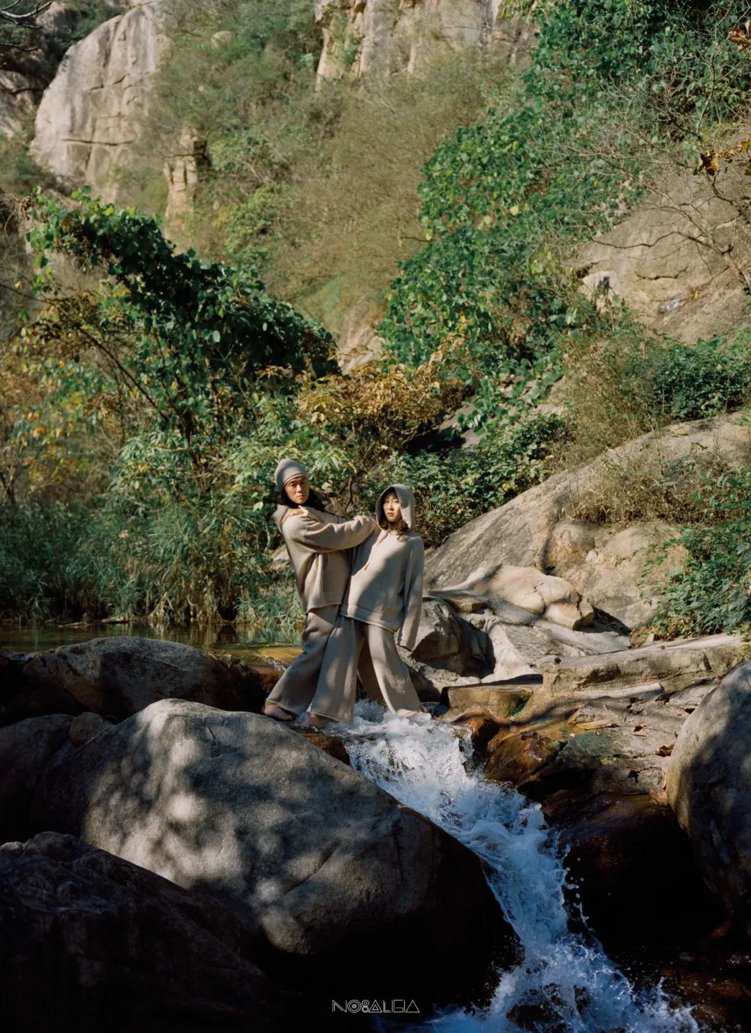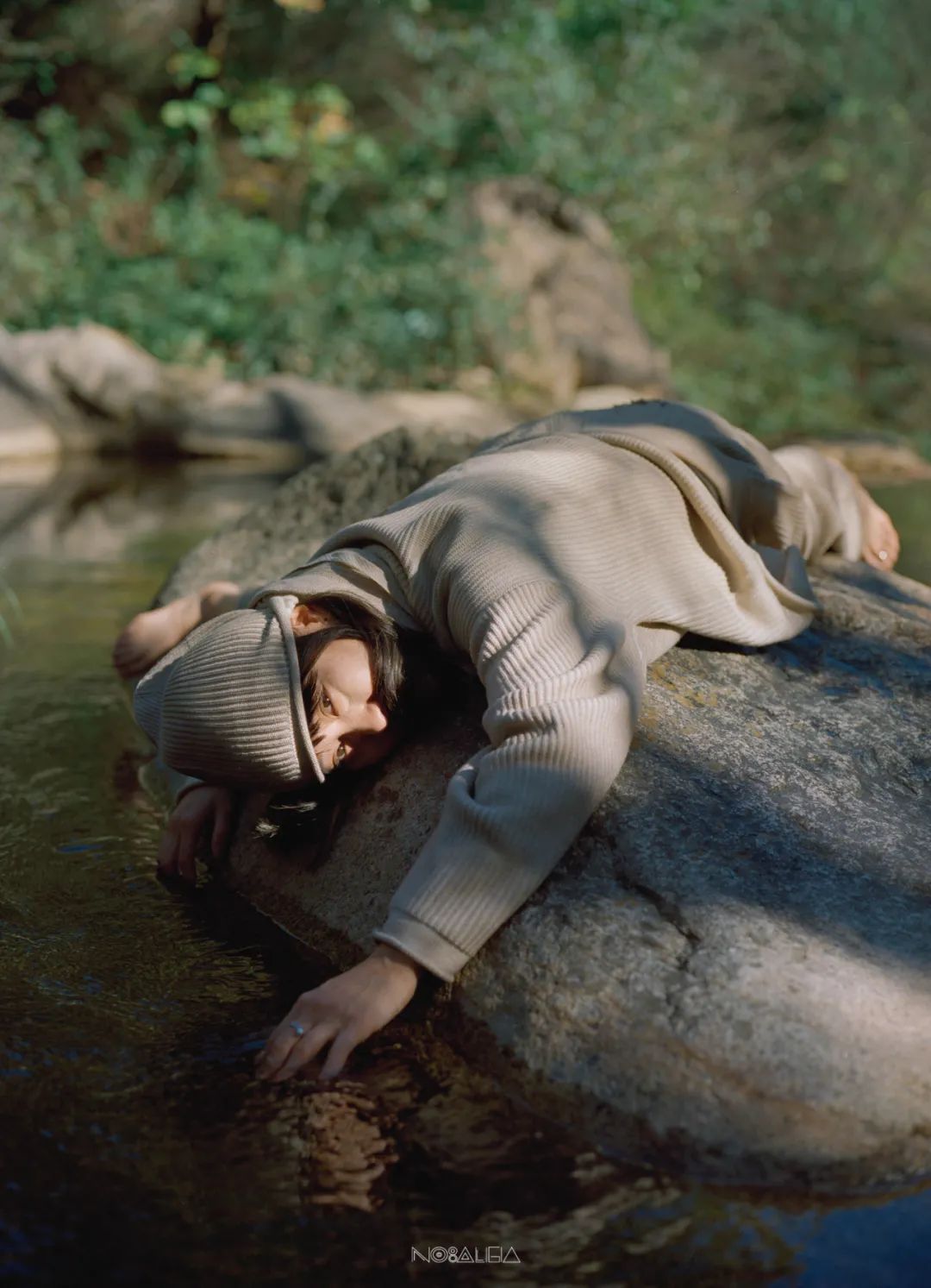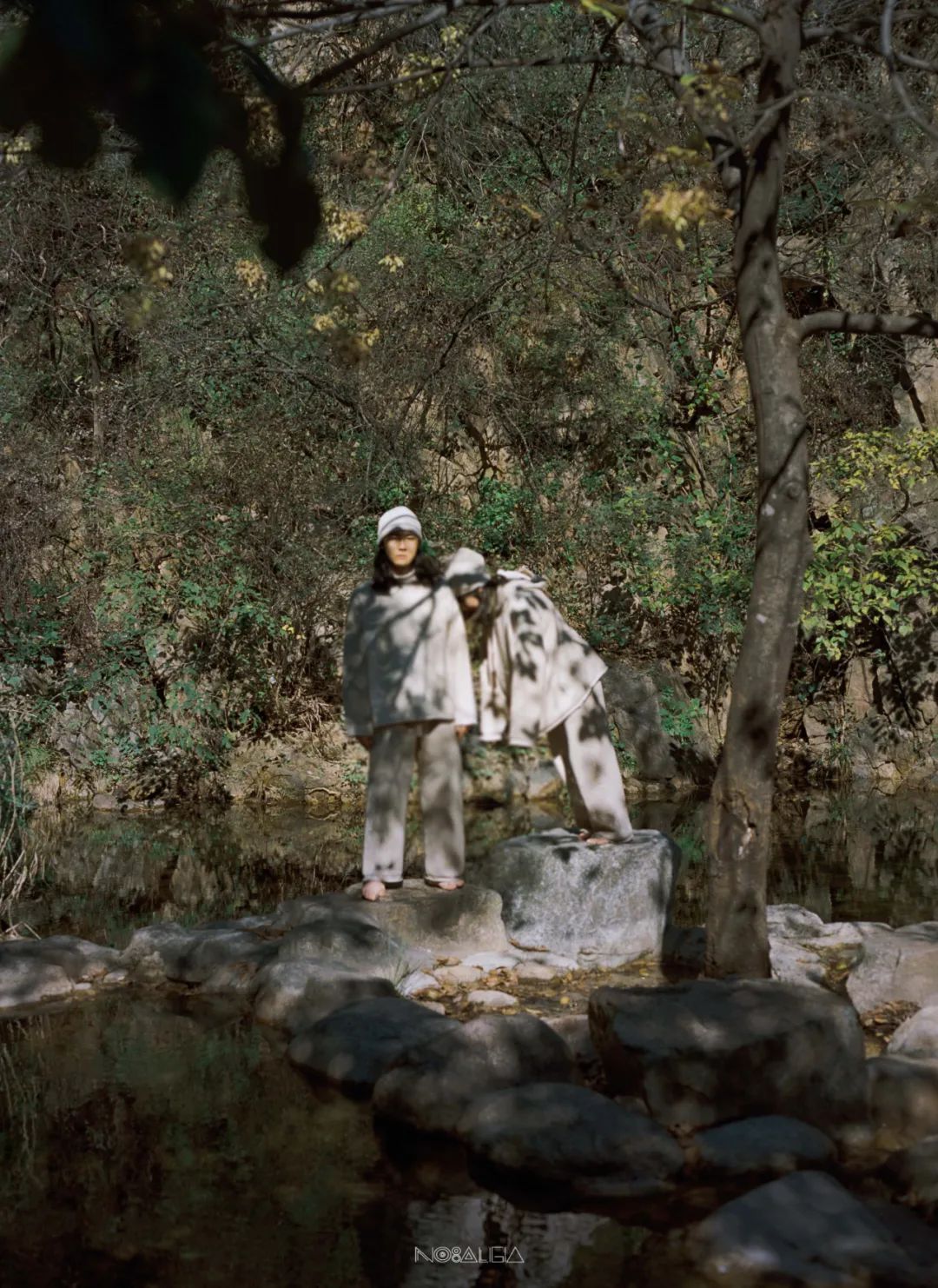 "这次我们驾⻋去了距北京80km的山区拍摄,我向往自然,想与它产生更多的交流,但它对于行动力 薄弱的我来说就变成了很奢望的事情。这次在拍摄LOOKBOOK的过程中我提着裤腿趟着水走到河中的一块石头上打滚,如果不是摄影团队给我这样的机会我真没想到我还挺喜欢这么做的,拍照时我 要保持一个姿势很⻓时间,这也给了我一些时间可以静静地去感受它,它的温度、质感、颜色,抬头看着云透过树枝缓慢的移动。进入秋季,河水的温度冰凉,需要一些勇气才能让手和脚在冰冷的河水中停留。当我们赤脚走回石路上,好在石头的温度能慢慢帮我们回归自己双脚温度。"