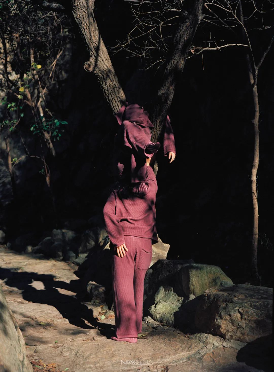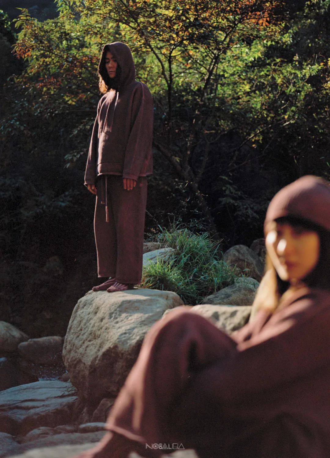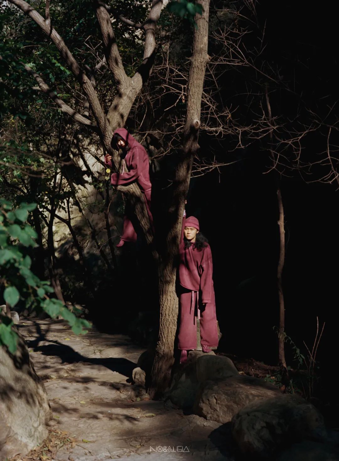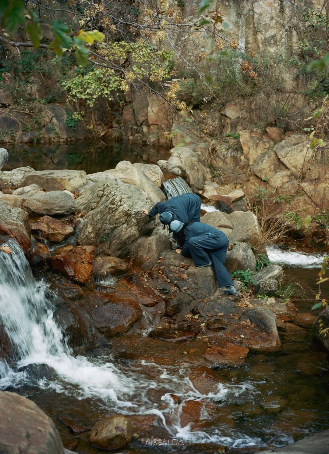 "这次我们驾⻋去了距北京80km的山区拍摄,我向往自然,想与它产生更多的交流,但它对于行动力 薄弱的我来说就变成了很奢望的事情。这次在拍摄LOOKBOOK的过程中我提着裤腿趟着水走到河中的一块石头上打滚,如果不是摄影团队给我这样的机会我真没想到我还挺喜欢这么做的,拍照时我 要保持一个姿势很⻓时间,这也给了我一些时间可以静静地去感受它,它的温度、质感、颜色,抬头看着云透过树枝缓慢的移动。进入秋季,河水的温度冰凉,需要一些勇气才能让手和脚在冰冷的河水中停留。当我们赤脚走回石路上,好在石头的温度能慢慢帮我们回归自己双脚温度。"