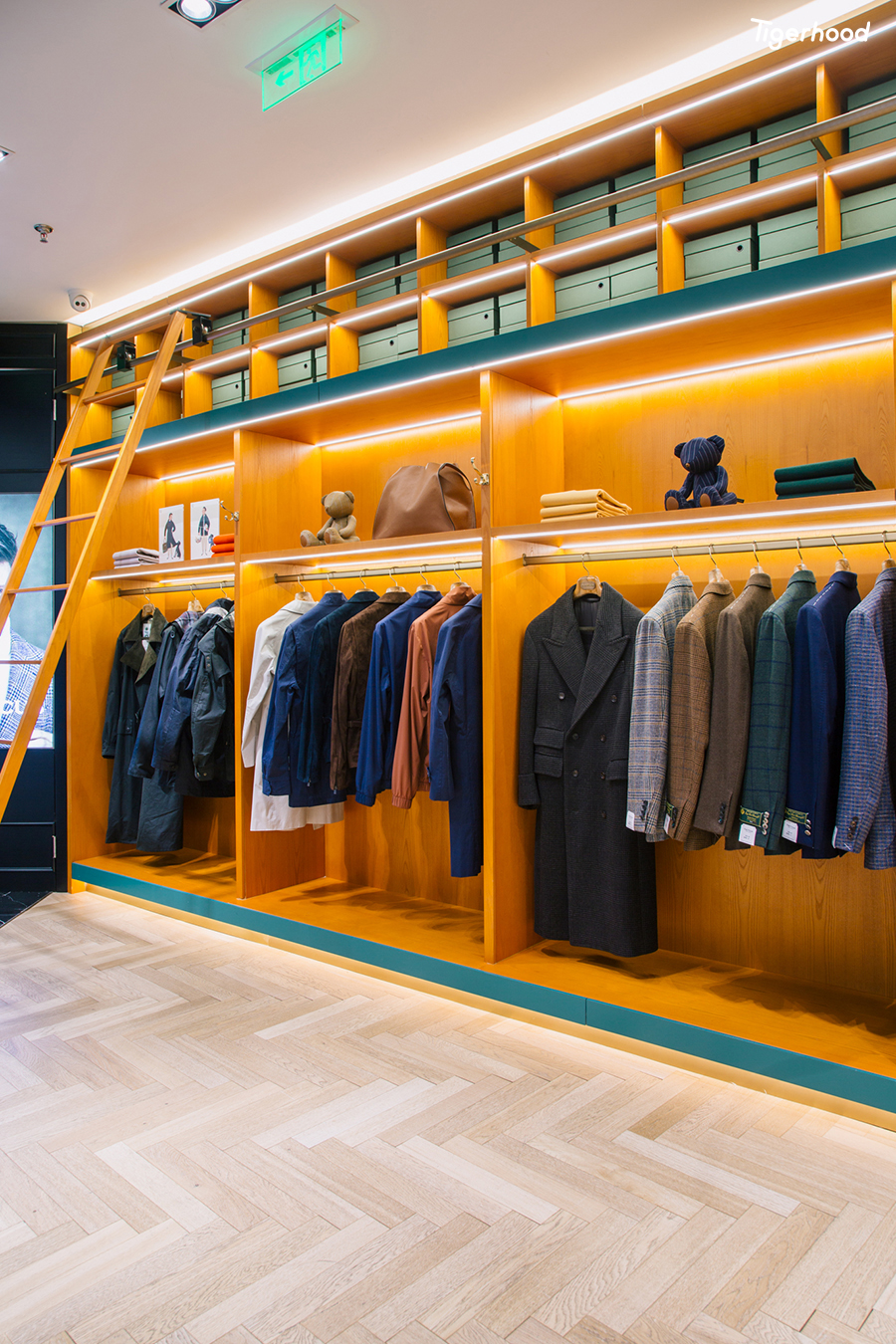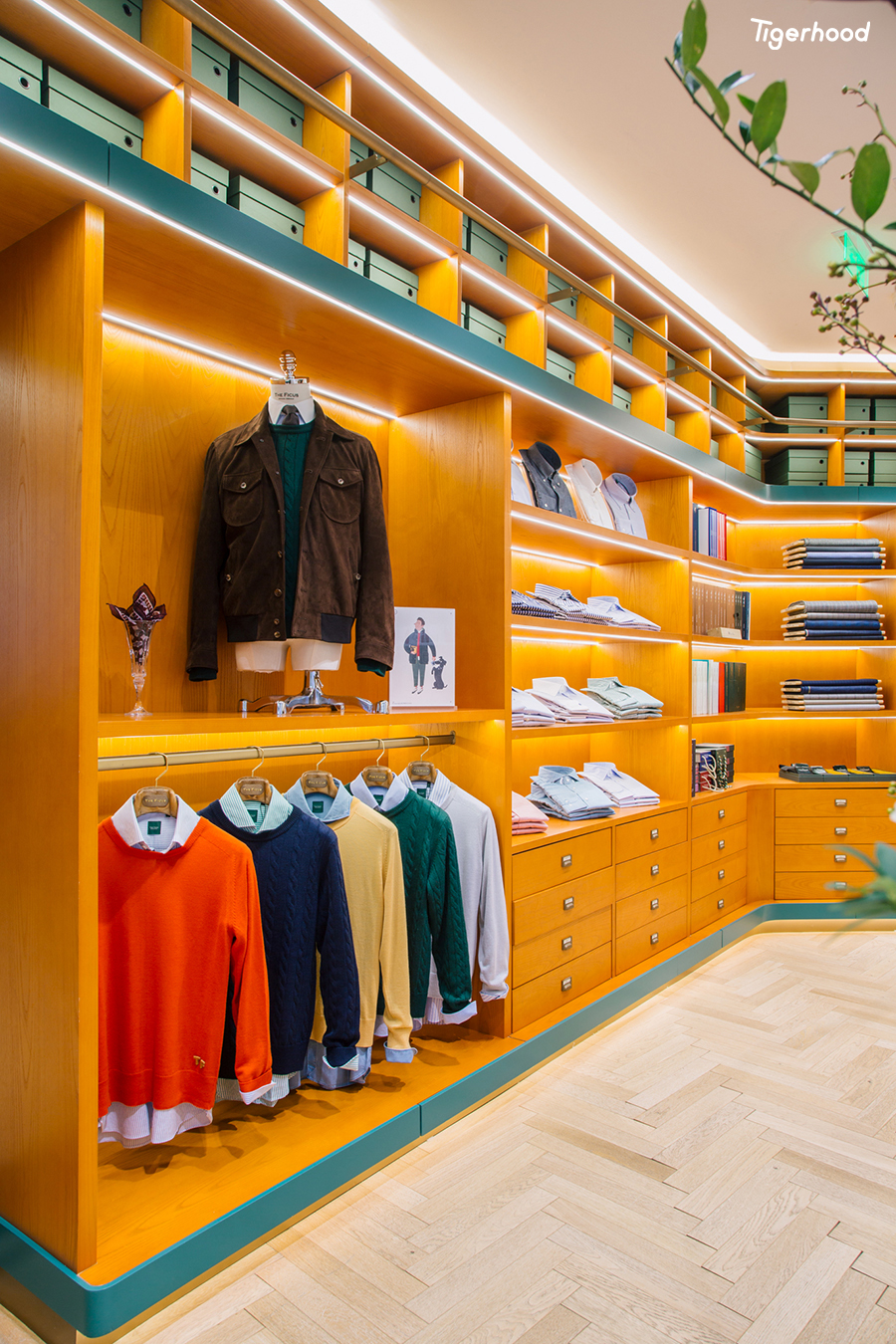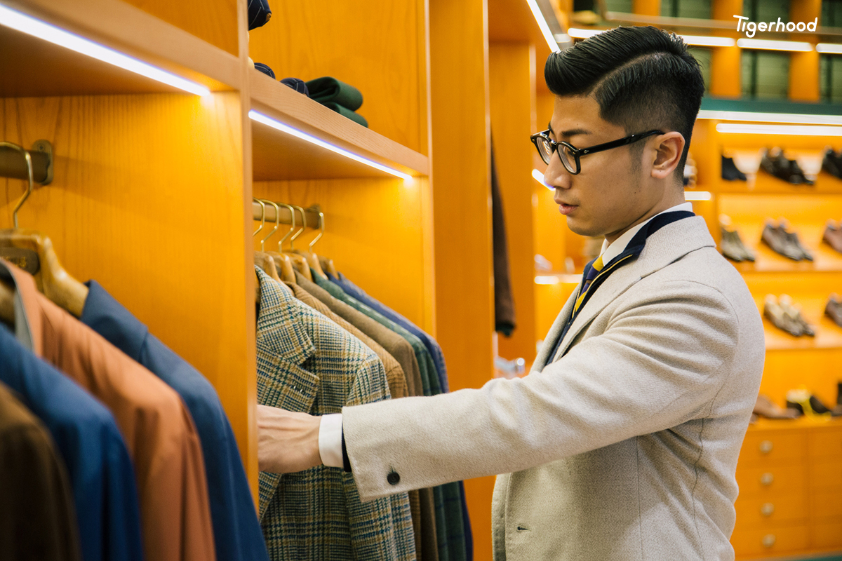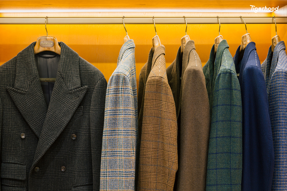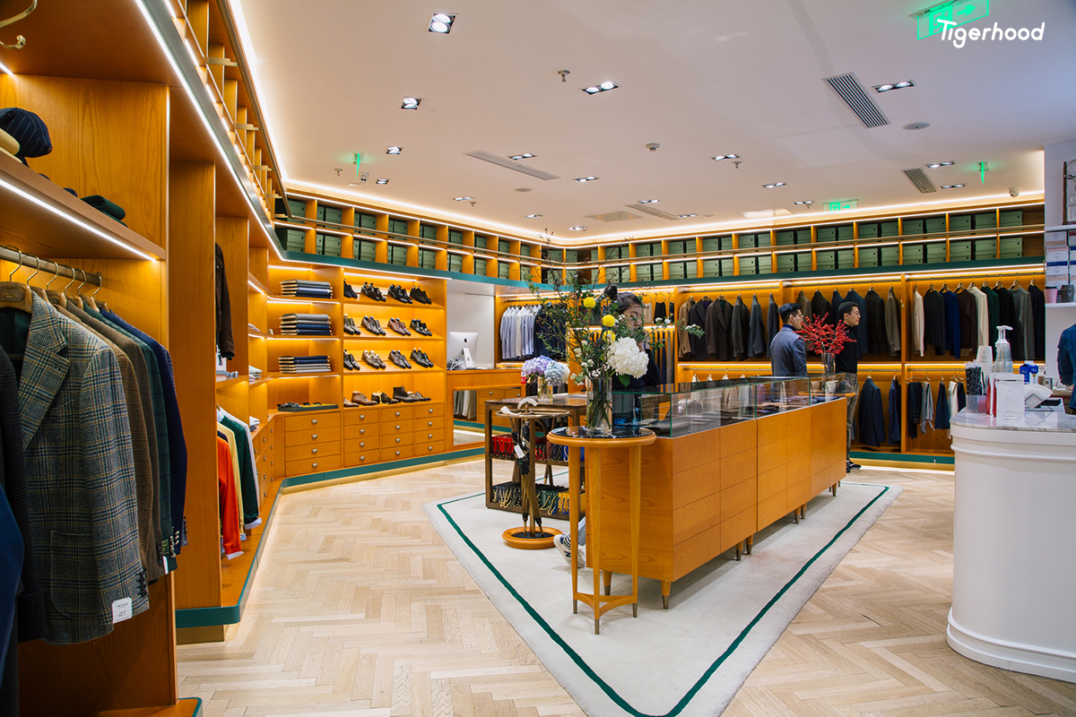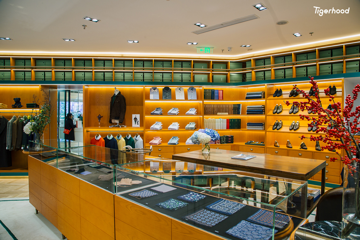 店内装饰整体偏向意大利风格,并融入许多欧洲元素,陈列着西装、大衣、衬衫、经典休闲装、各类配饰等全品类男装产品。除了成衣外,店内还提供手工西装定制服务,始终坚持以“匠人精神”为核心,提供男士整体搭配解决方案。
