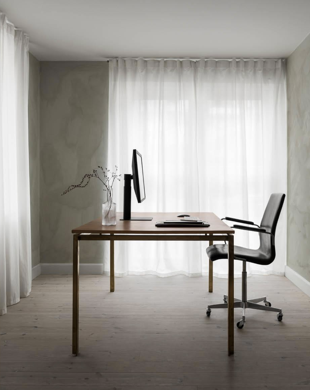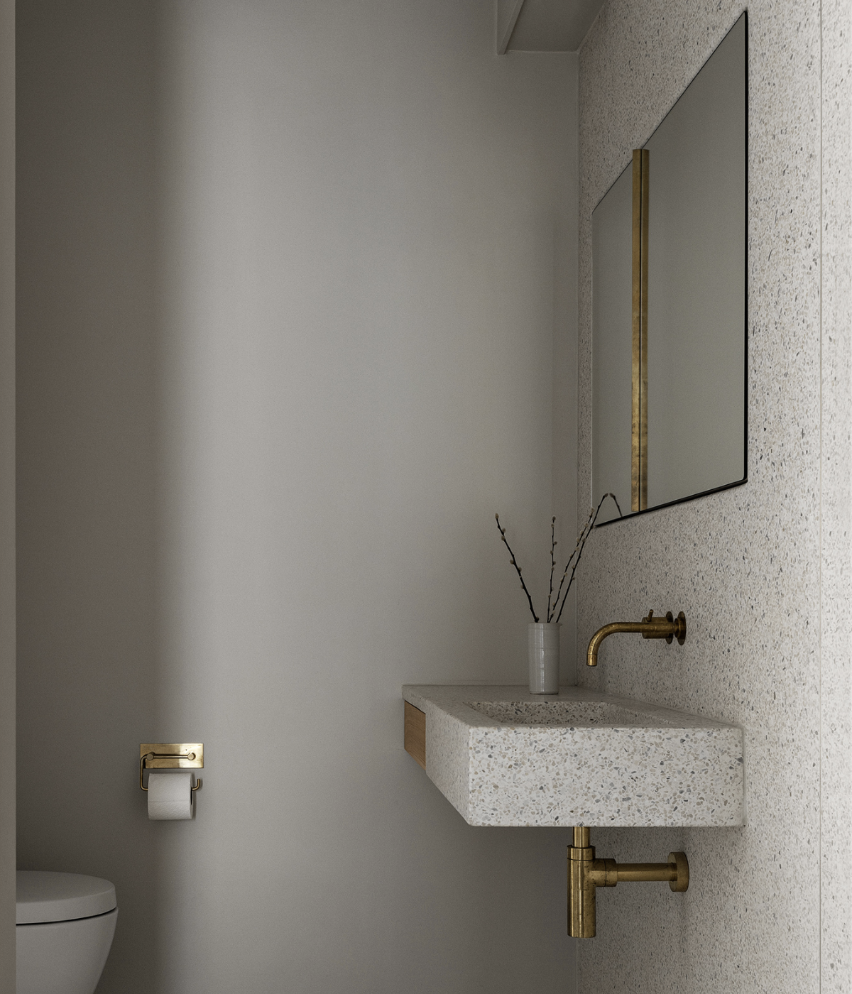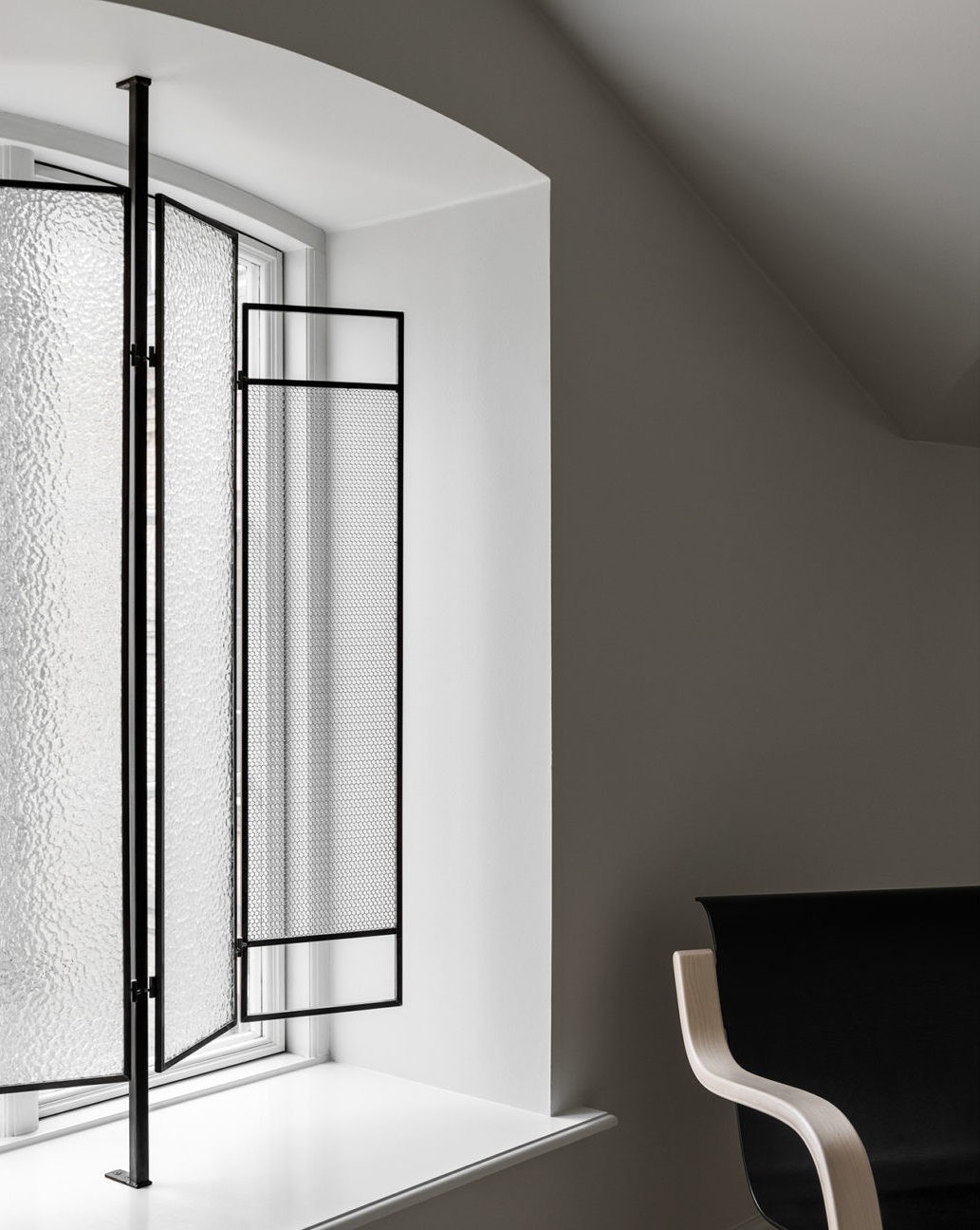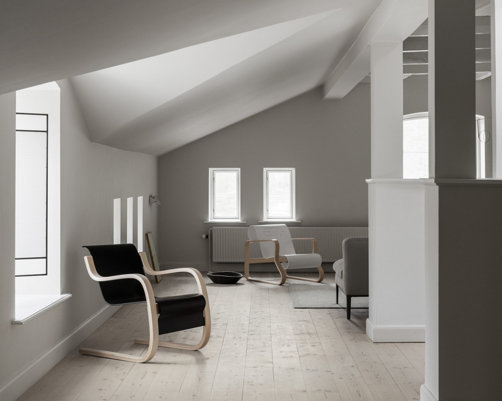 专注于天然材质与极简几何设计元素的Frama Studio给这座古老建筑注入老现代摩登的基因,包括家具、灯饰、杂货、织物等都围绕这极简的风格,统一的低饱和白色墙面增加了原本空间的开阔感搭配经典的黑色与木质元素给人以干净整洁的舒适质感。