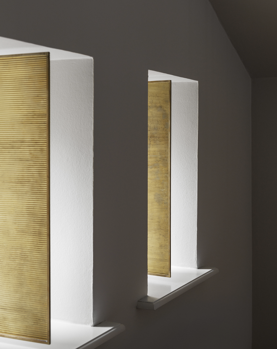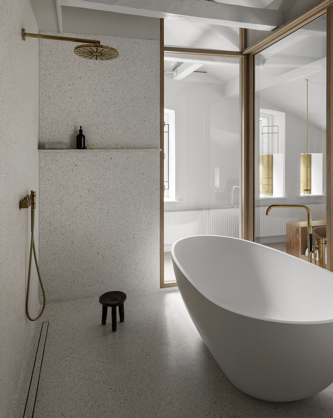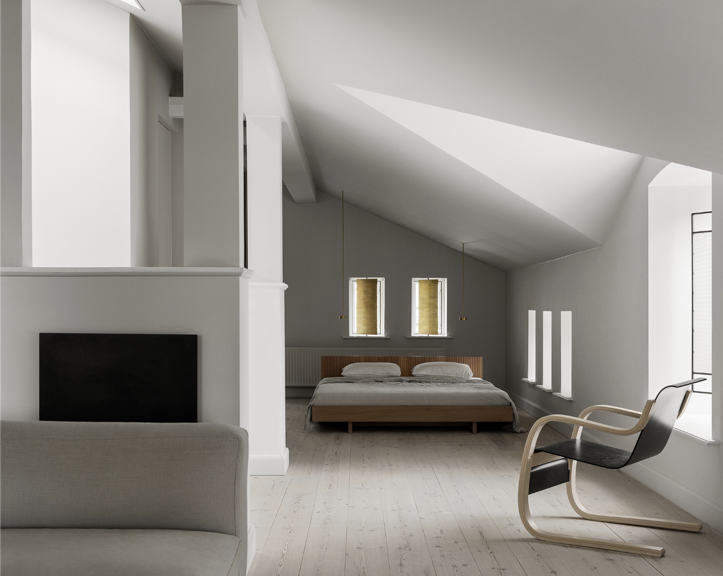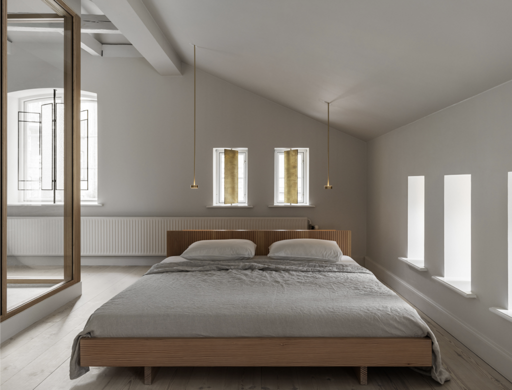 由于是传统尖式屋顶的设计,卧室的空间通过拱门式窗户的设计引入更多光线,黄铜的吊灯与黄铜色百叶窗统一营造低调的奢华感。极简设计的背后别具巧思又不虚张声势,少即是多的概念充满了整个空看,可以说是老宅转为现代家居的典范。
