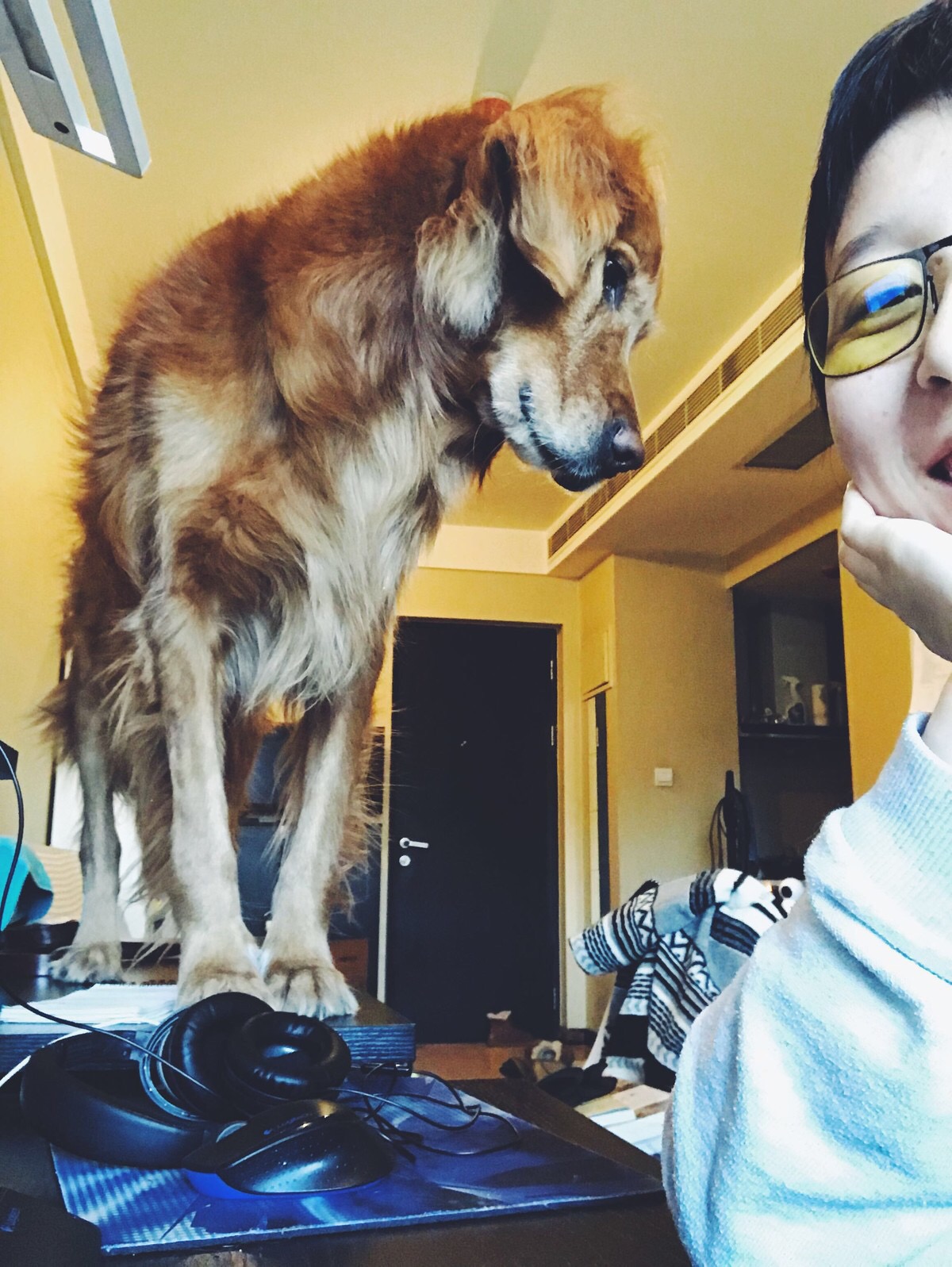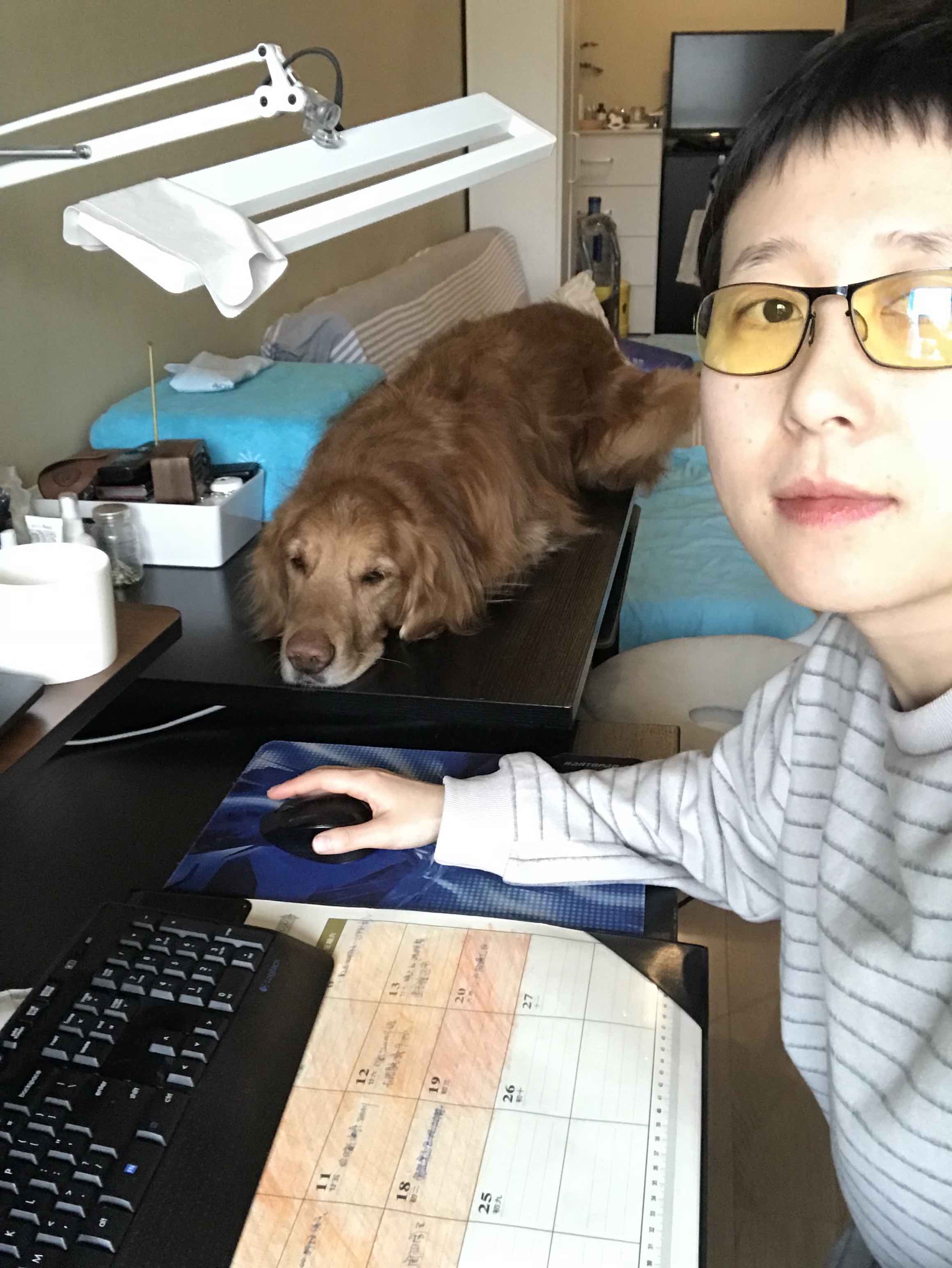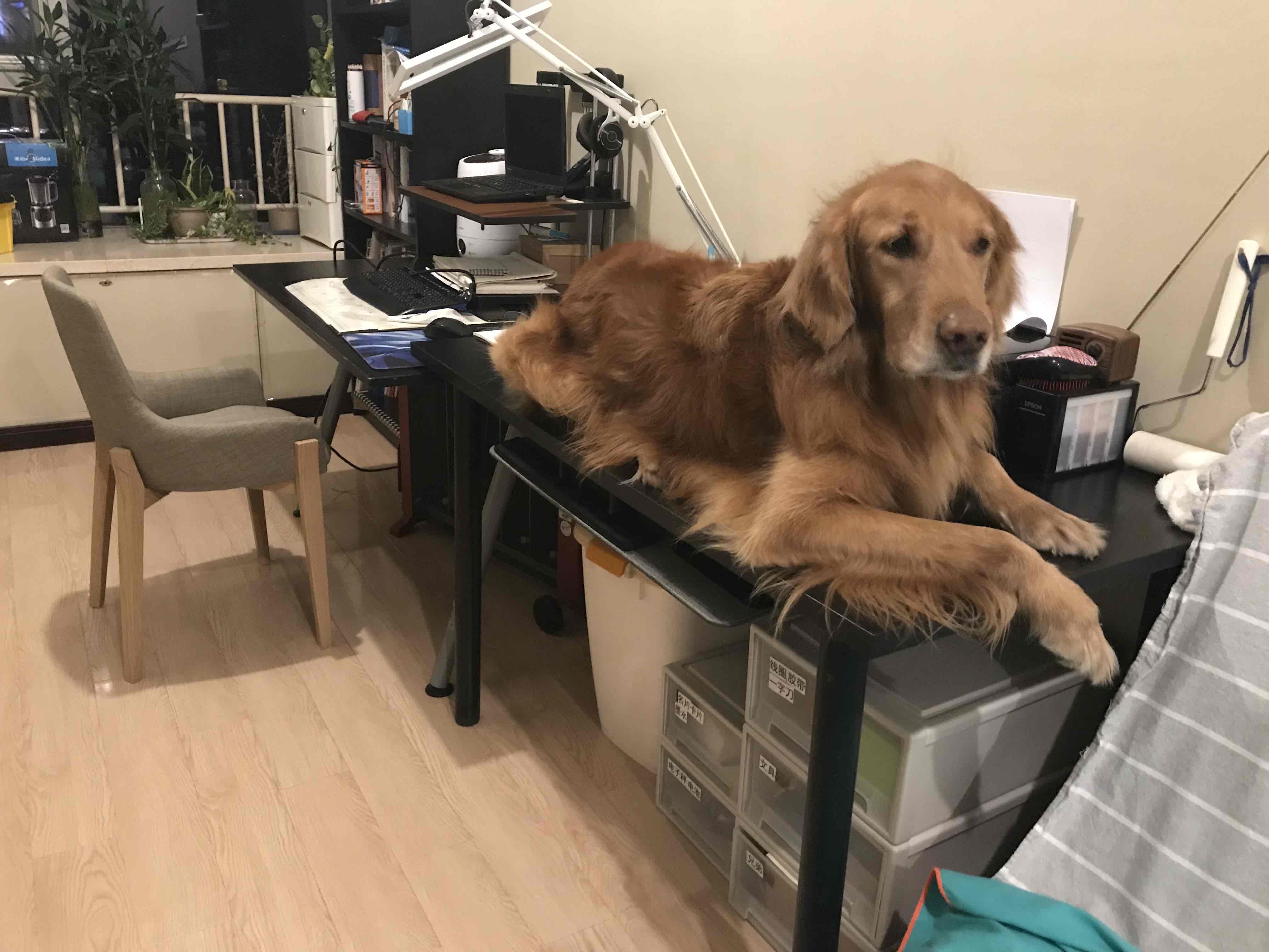 每次我牵着它去楼下超市买菜或者取快递,它都会很开心地叼着买回来的菜和快递盒往家里跑,并一路接受路人的赞美和惊叹。所以对于这位小区里的明星快递犬,取拖鞋当然是小菜一碟。只是它从来不会把我的拖鞋叼给我,而是在我进门的那一刻,把我的拖鞋或刚换下来的鞋叼着跑开,让我穿着袜子满屋子追着它要鞋。除了叼快递之外,布丁在五岁的时候无师自通地喜欢上了爬上书桌,在我摆满杂物的书桌上,找出一小块空地,趴下,看着我打字。