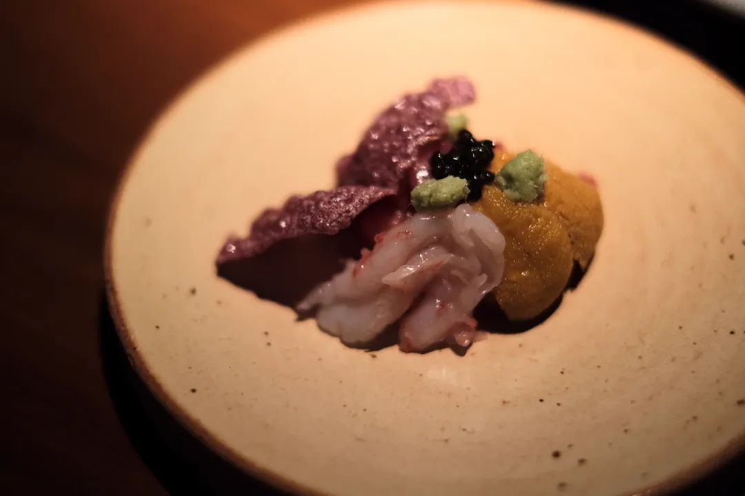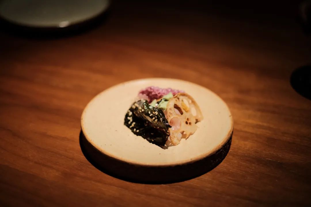 热腾腾的海鲜饼,被 Tom Ryu 改造为一道凉拌下酒菜,蔬菜海苔脆片下面盖着金枪鱼、甜虾、海胆。