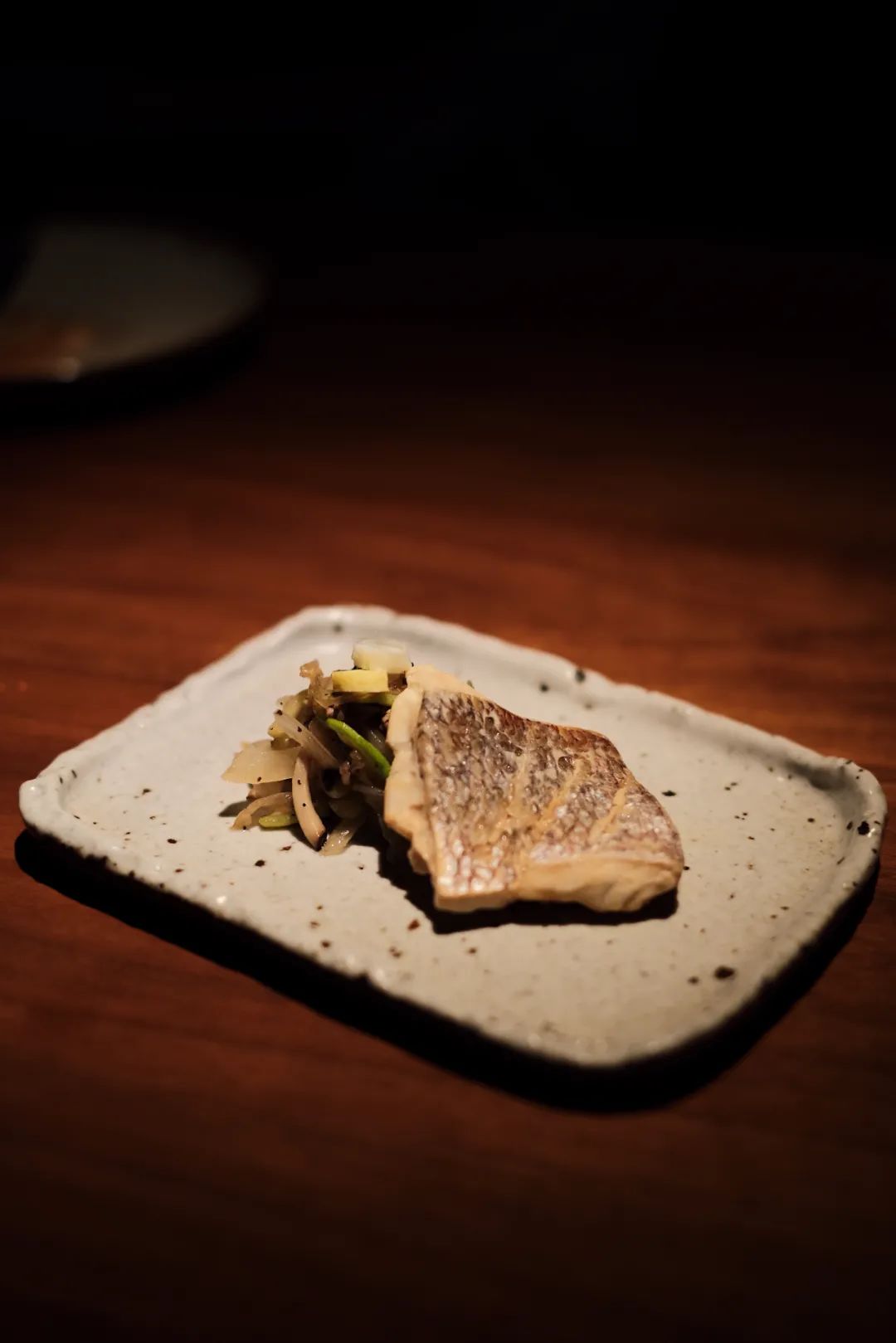 鲷鱼配野蕨菜,菜单上介绍是“14世纪朝鲜王朝门阀许氏家族的独门烹鱼技法”。