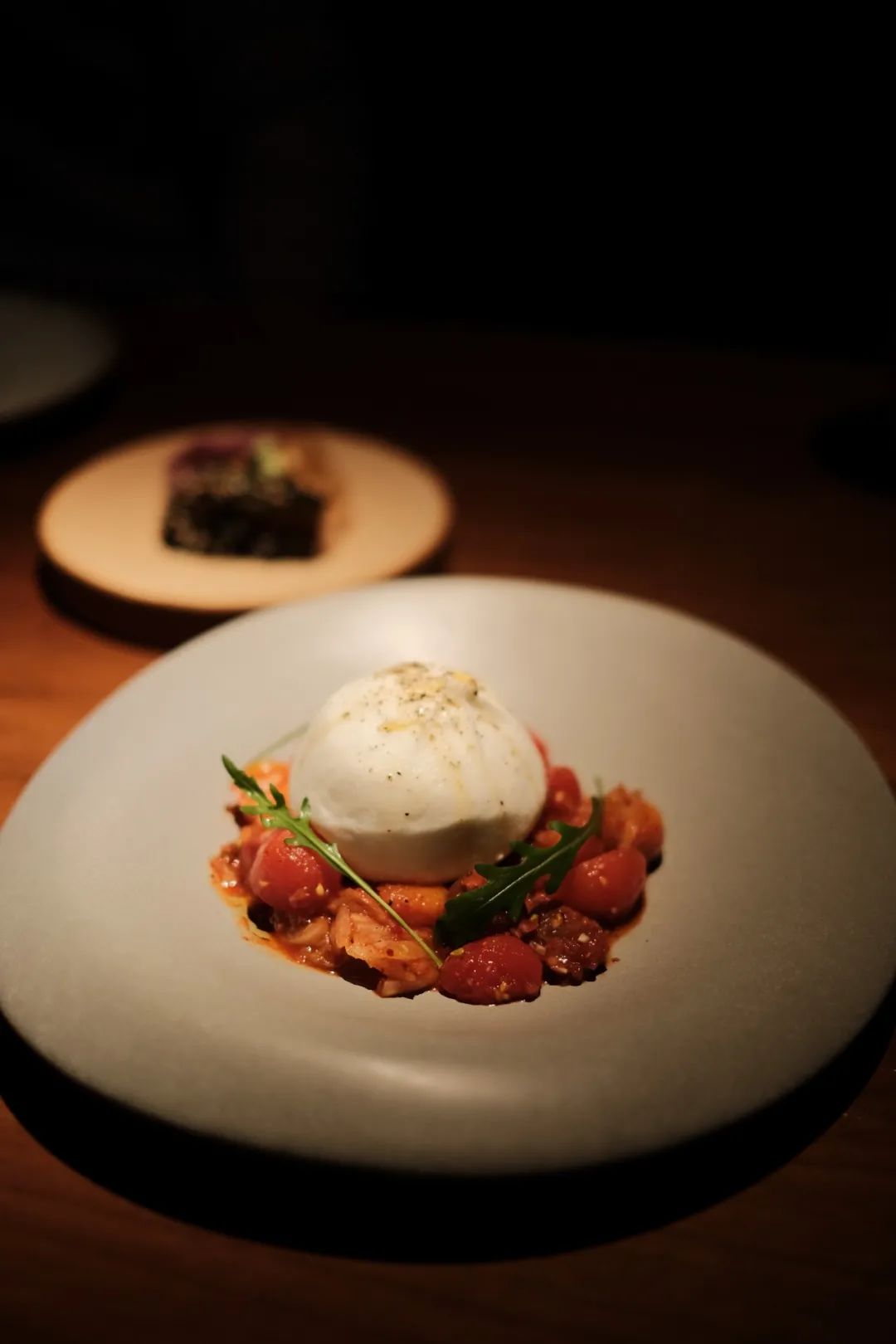 看起来是番茄布拉塔芝士,奶酪撕开里面是豆腐,下面配了些辣泡菜,泡菜拌豆腐那自然是很好吃的。