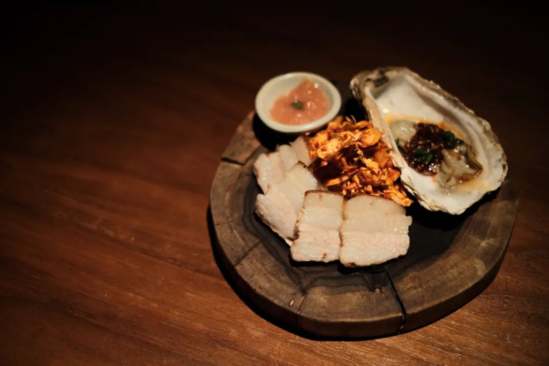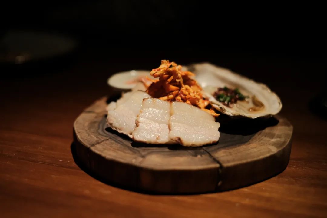 「无界新膳味」菜单的主菜,初冬时候韩国家家户户必吃的五花肉料理,猪肉用香料煮过后切成薄片,配生蚝、泡菜、明太子。