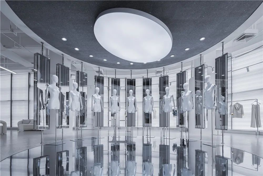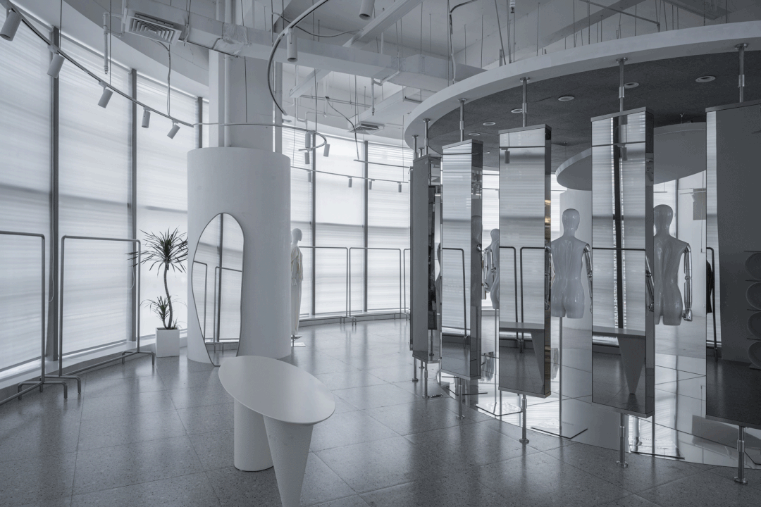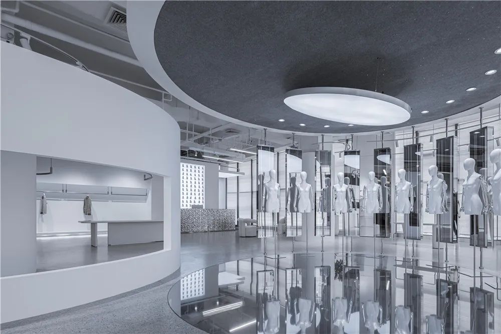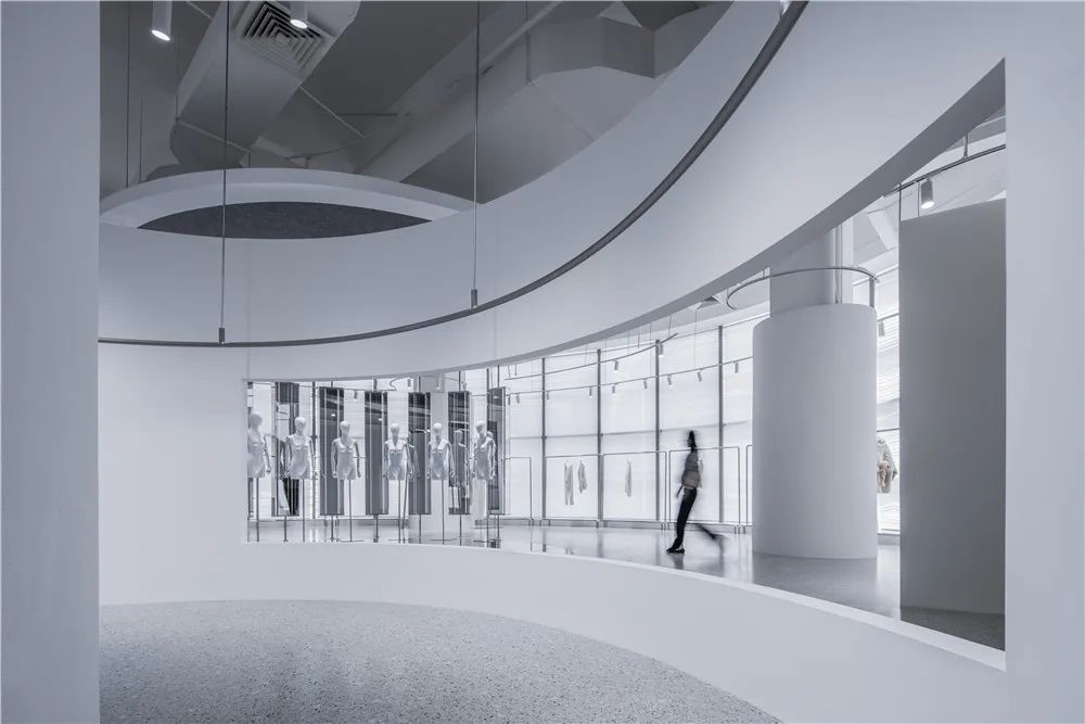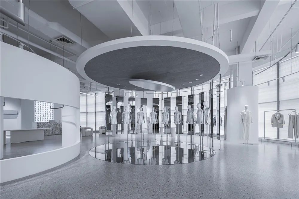 “镜湖区”根据不同时间和情景下为顾客提供千变万化的体验,每一次的访问都略有不同,视情景与主题旋转不同角度,试图超越对功能(需求)与形式(欲望)的传统争端,而指引向诗意的想象。空间的布局、构成、动线沿着圆形自然而然的生长出,顾客从“镜湖区”的外部走进内部,沿曲线界面的流动行进,自然而然地穿越两个环形,再从圆形空间装置的内部走向外部。所经之处,即是舞台。