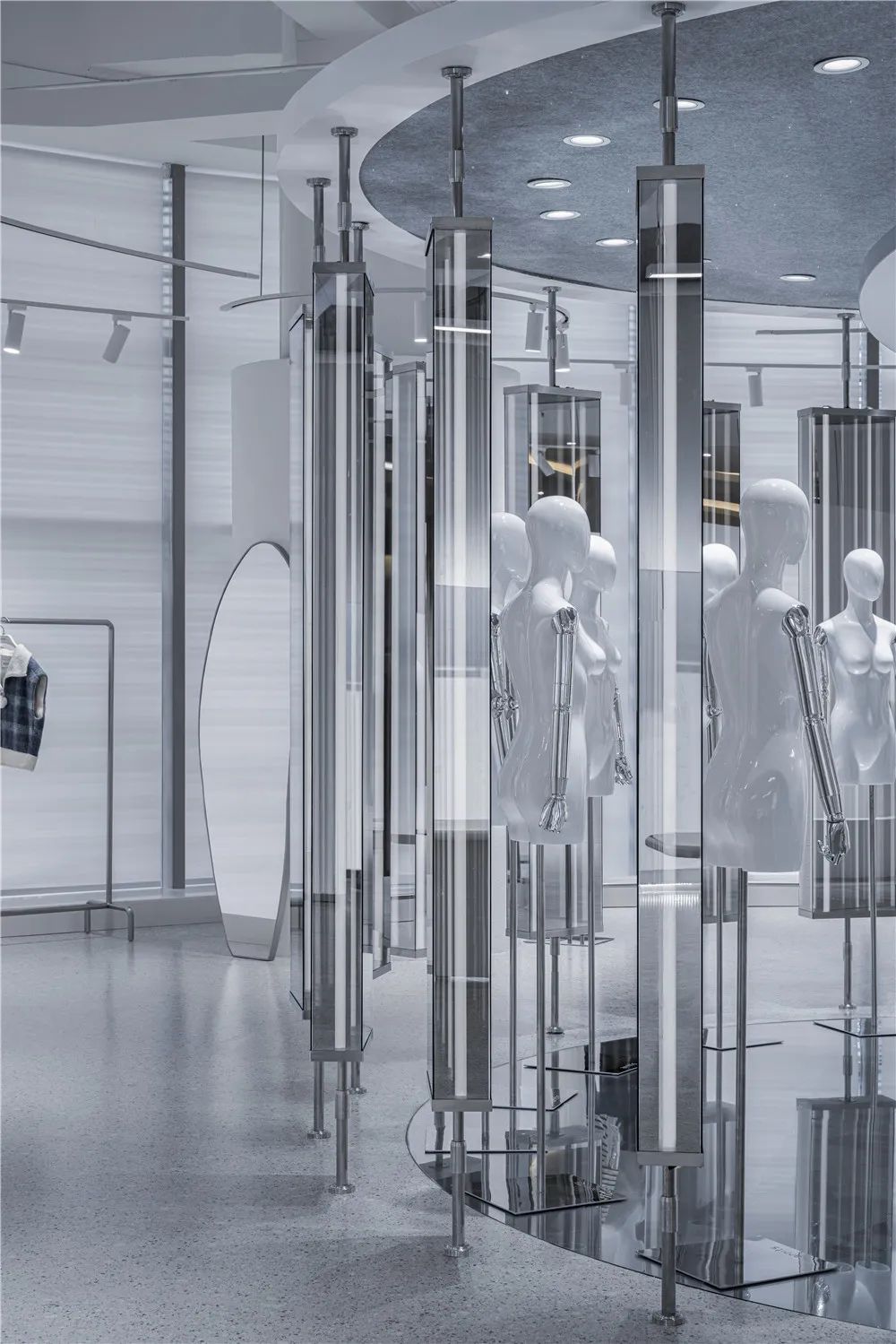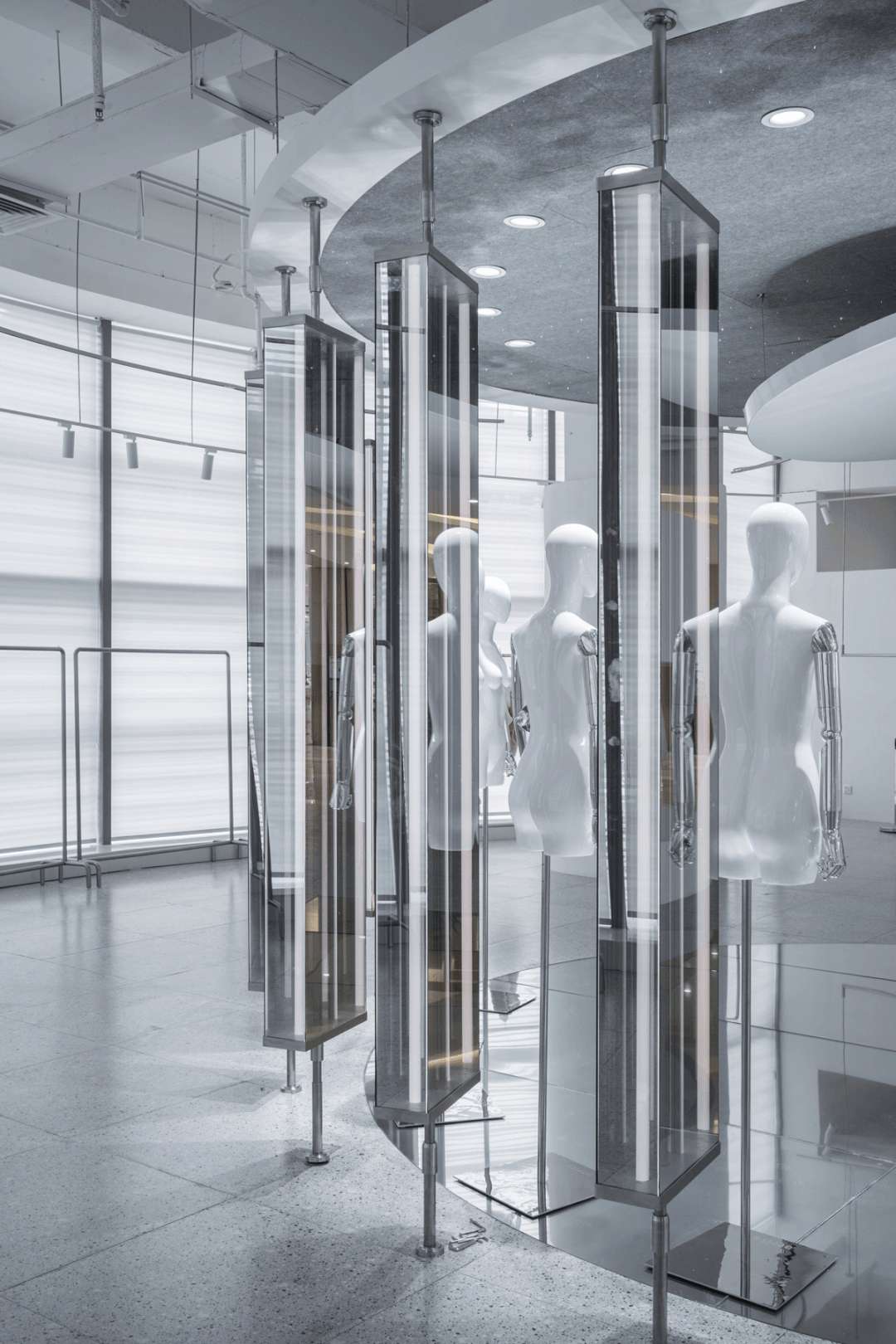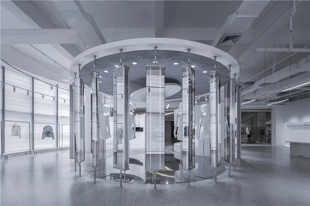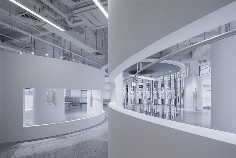 “镜湖区”根据不同时间和情景下为顾客提供千变万化的体验,每一次的访问都略有不同,视情景与主题旋转不同角度,试图超越对功能(需求)与形式(欲望)的传统争端,而指引向诗意的想象。空间的布局、构成、动线沿着圆形自然而然的生长出,顾客从“镜湖区”的外部走进内部,沿曲线界面的流动行进,自然而然地穿越两个环形,再从圆形空间装置的内部走向外部。所经之处,即是舞台。