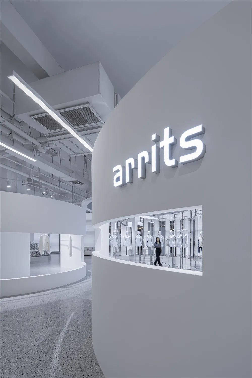arrits是集雅趣、现代、简约与艺术为一体的女装品牌集合店。木月建筑设计事务所 (MOON Architects) 结合空间装置,用艺术性的当代语言来实践一个300平方米的商业空间。设计将山行水迹、日月盈昃、辰宿列张的概念通过平面布局、立体构成、筹划空间事件运动展现,在一种未知的欲望下进行创造空间语言,以诠释“日月在天空中运行往复,日出日落,月圆月缺。星辰闪烁张布,各按自己的位置,陈列散布在辽阔的空中”。