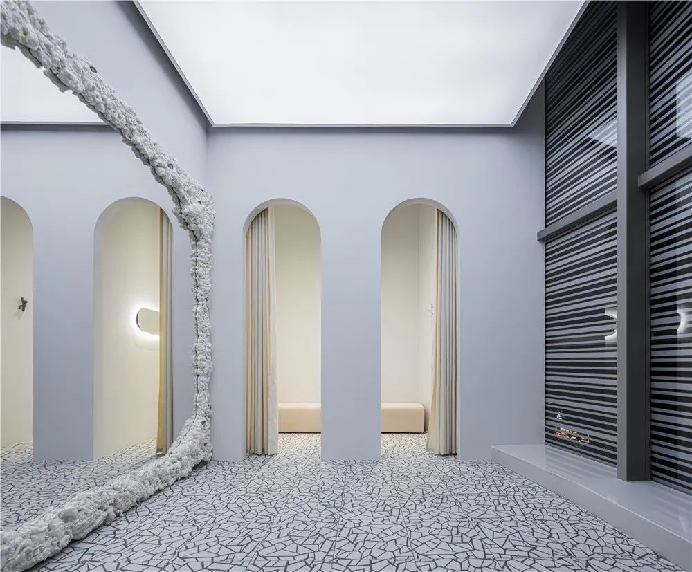 入口处通过打开店铺前场模糊了既定边界,也让商场公区与店铺自然过渡。入口区域的曲面矮墙起到了流线组织和功能划分的作用。入口处依附着柱子而形成的曲线,动线被沿着对立的圆形自然而然的设置,首先映入眼帘的是一条曲径通幽的小路,透过两边的裂口窥探出另一个新的世界,弧形环绕包裹,采用环绕手法制造出豁然开朗的游园惊梦感,融入了中国古典园林中的设计手法(小中见大、借景、藏露),“曲”路增加了赏景路线,延长了消费游览时间,扩大了空间感,也造成“山重水复无疑路,柳暗花明又一村”的藏露对比。这是一次探索之旅,以游园的动线,让体验者产生好奇、探索、惊喜等情绪。