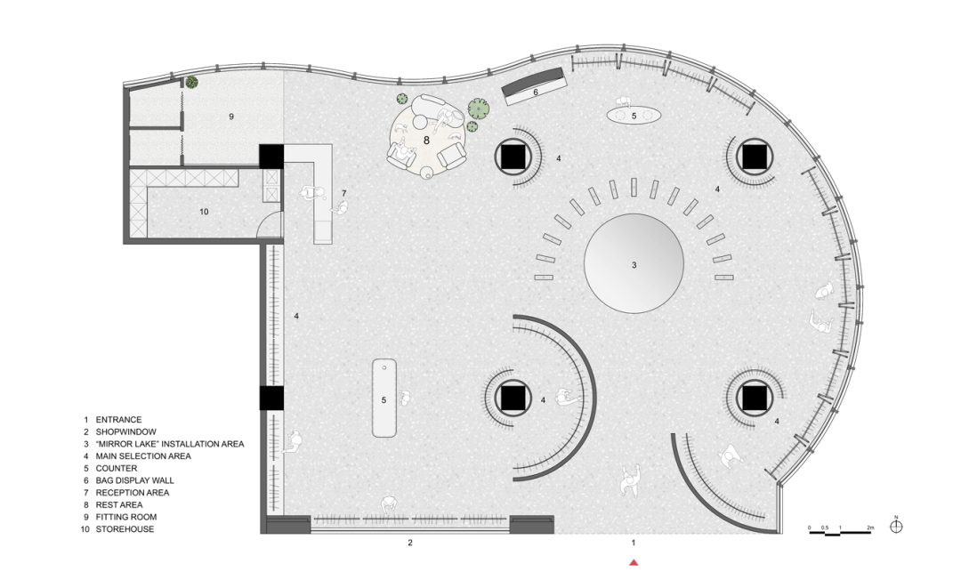 “镜湖区”将顾客的视觉中心直接引入内部的空间环境,同时也利用了空间的仪式感召示吸引顾客,使其成为可广为流传的形象输出,而通过“镜湖区”的视觉渗透与引导,圆形布局、向心与发散,最大限度使四周作为展示之用,更能紧密的围绕具有仪式感的中心空间。“镜湖区”作为事件发生的容器,静默等待着接下来各种事件的发酵与酝酿。