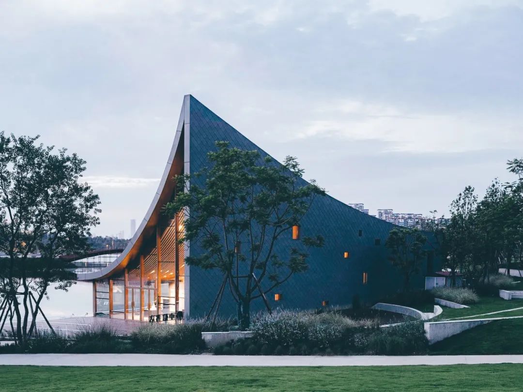 被誉为“成都最美水下书店”的兴隆湖中信书店在 2018 年举办了一个“兴隆湖书店建筑创意设计竞赛”,由获得大赛第一名的 MUDA 慕达建筑负责设计,耗时三年,这个大项目终于在 2021 年跟大家见面了。书店以“一本天上掉落的书”为构思,建筑外形取意于“书”。得益于滨水的地理优势,建筑师将建筑与开阔的湖面相连,临湖侧的玻璃幕墙延伸至水下一米处,与兴隆湖公园的自然环境融为一体。