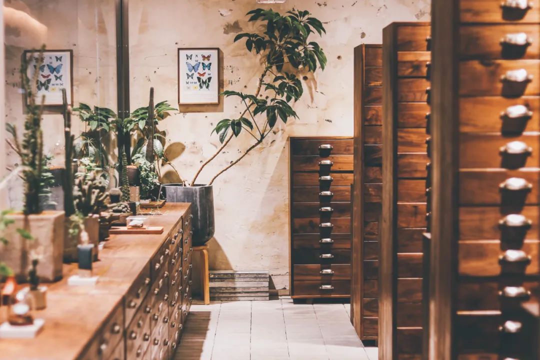 以动植物标本为卖点的荒石公园新空间延续了以往自然质朴的日系风格,采取柜式抽屉的方式进行分类,每一幅作品都有专属数字编码。进入荒石公园,你会发现这里的一切都像植物一样慢、一样静,犹如人们放慢脚步后休憩的世外桃源。