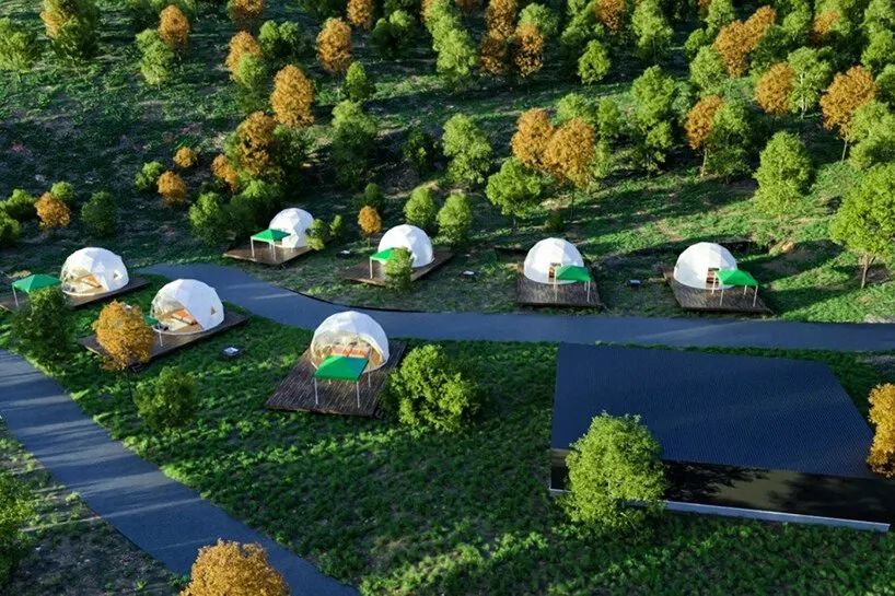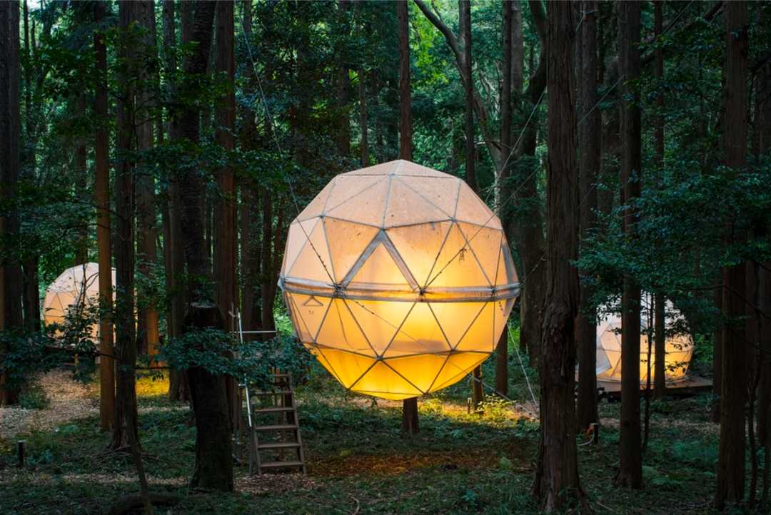 这些帐篷完美的融入了森林郁郁葱葱的绿意之中。每个独立圆顶帐篷规格不同,可容纳不同数量的客人。这个作为山梨县鹤市第一个大型圆顶露营地The forest已于今年7月向游客开放。