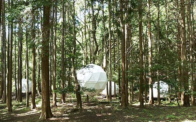 The forest坐落在山梨县的一片林地里。笔直、高大的针叶林旁,流淌着清澈清澈的山溪,鱼儿自由穿梭。细细聆听,还能听到林间的窃窃私语。针叶林中,一个由7个圆顶帐篷组成的集群形成了浪漫的“森林营地”。