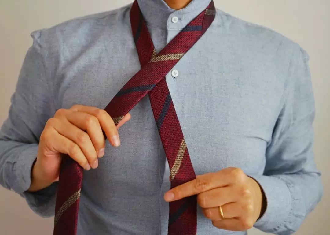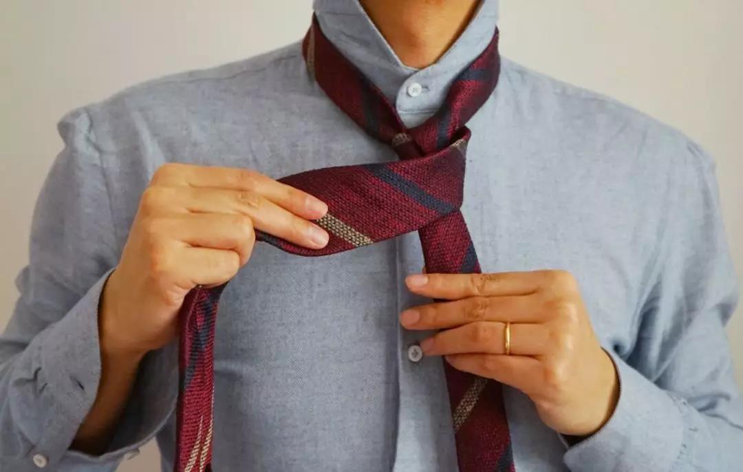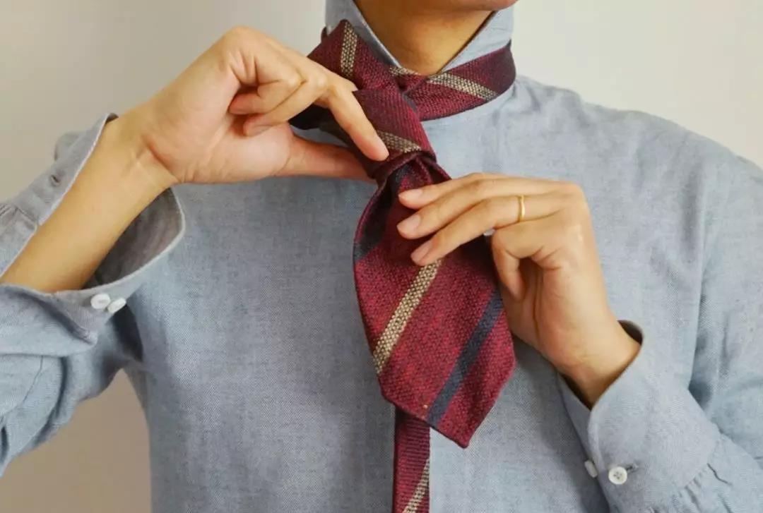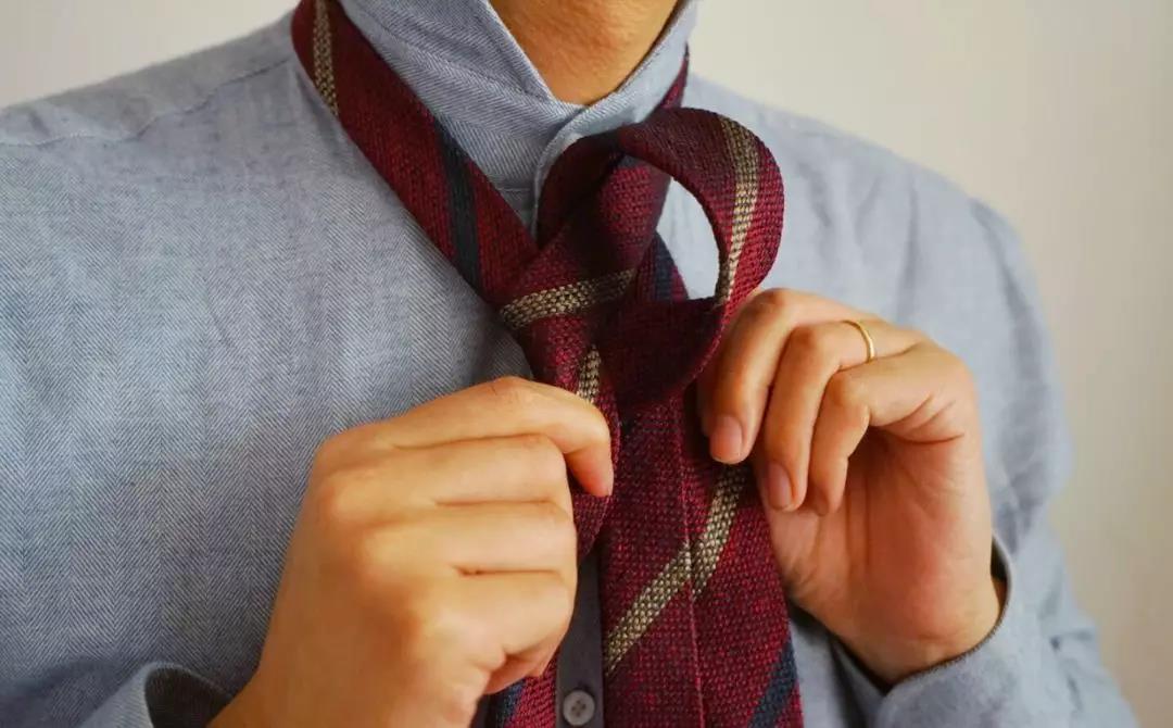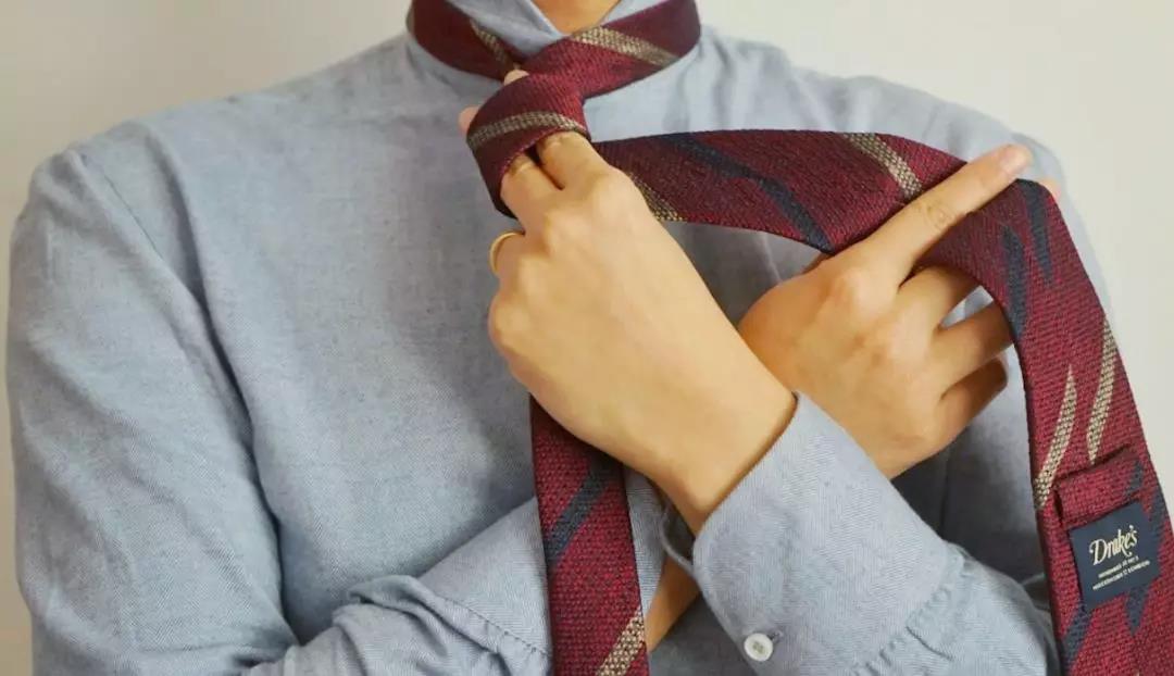 最休闲简单的系法,由于打出的结尺寸比较小,适合厚度较厚的呢子或羊毛领带,特别适合搭配复古、工装等元素。
