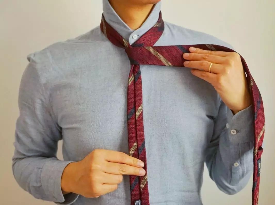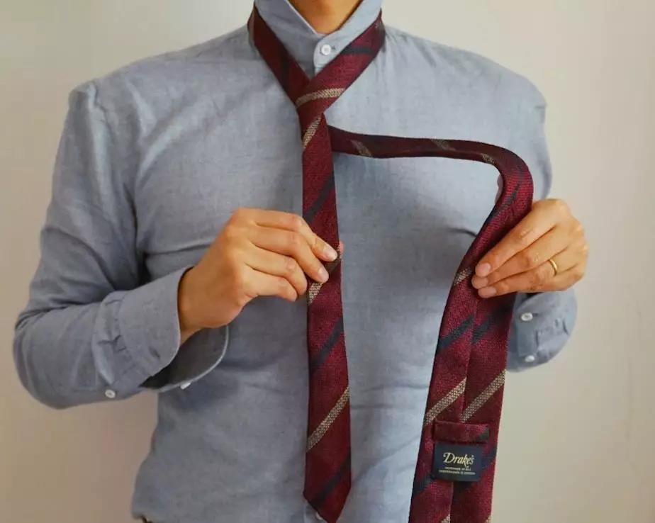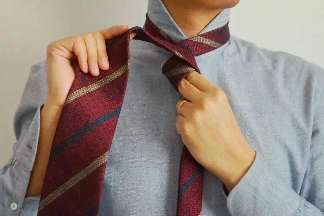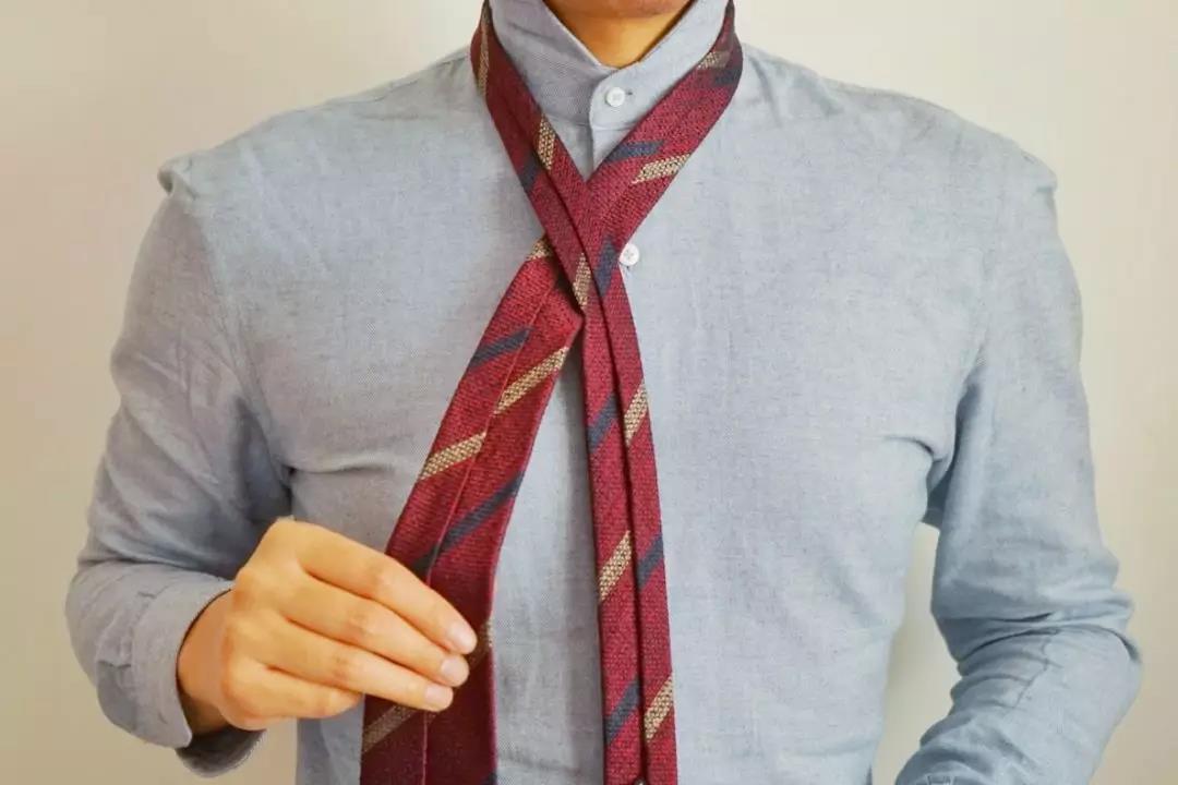 最休闲简单的系法,由于打出的结尺寸比较小,适合厚度较厚的呢子或羊毛领带,特别适合搭配复古、工装等元素。