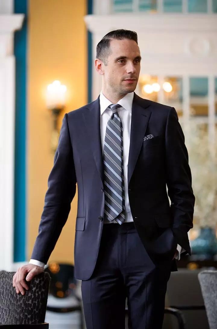 商务套装也可以对领带大小剑长度比例作一些适度变化调整,活力又不失专业感。小剑也是领带的一部分,充分利用好它。