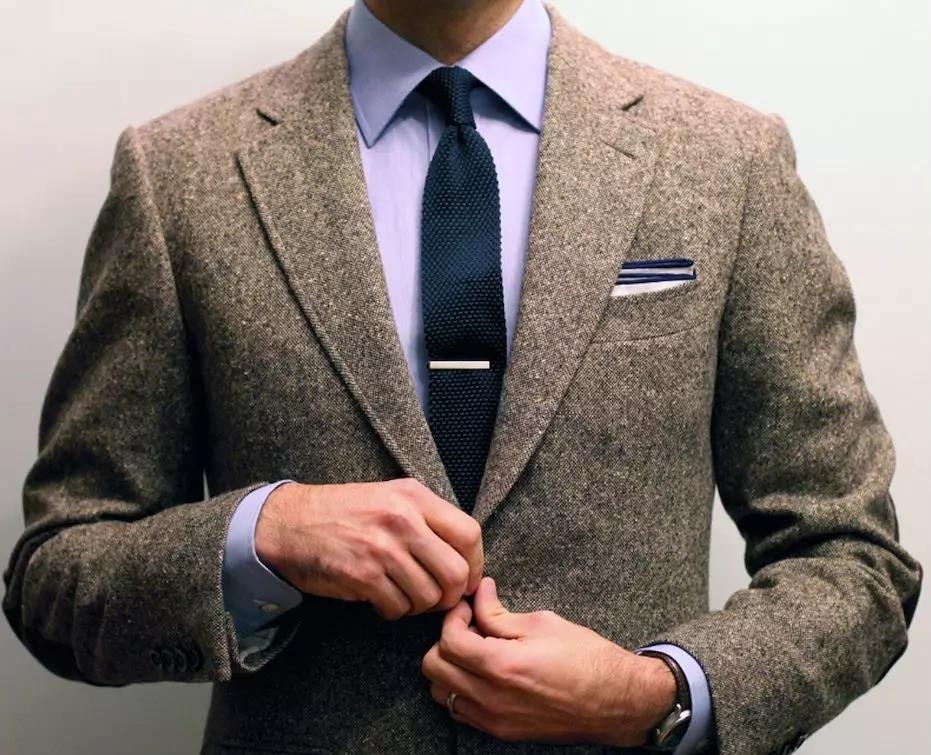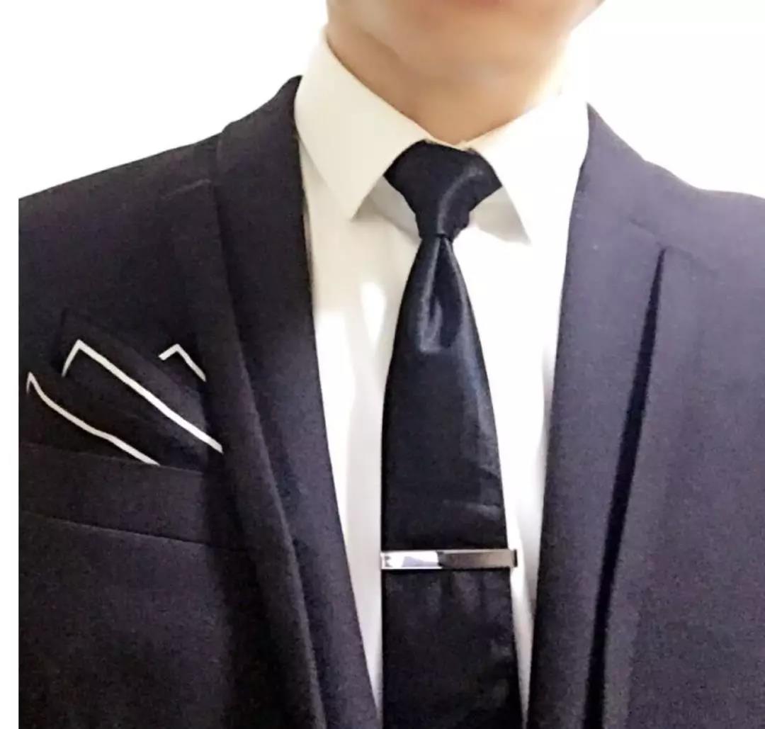 领带夹最好夹在衬衫上数第3、4扣中间,过低会拉低视觉重心;过高会有卡脖子的感觉。成套使用和领带完全相同花纹、颜色的口袋巾是初学者容易犯的错误,在老手看来这是缺乏搭配技巧的表现。更不用提多此一举的领带夹了。