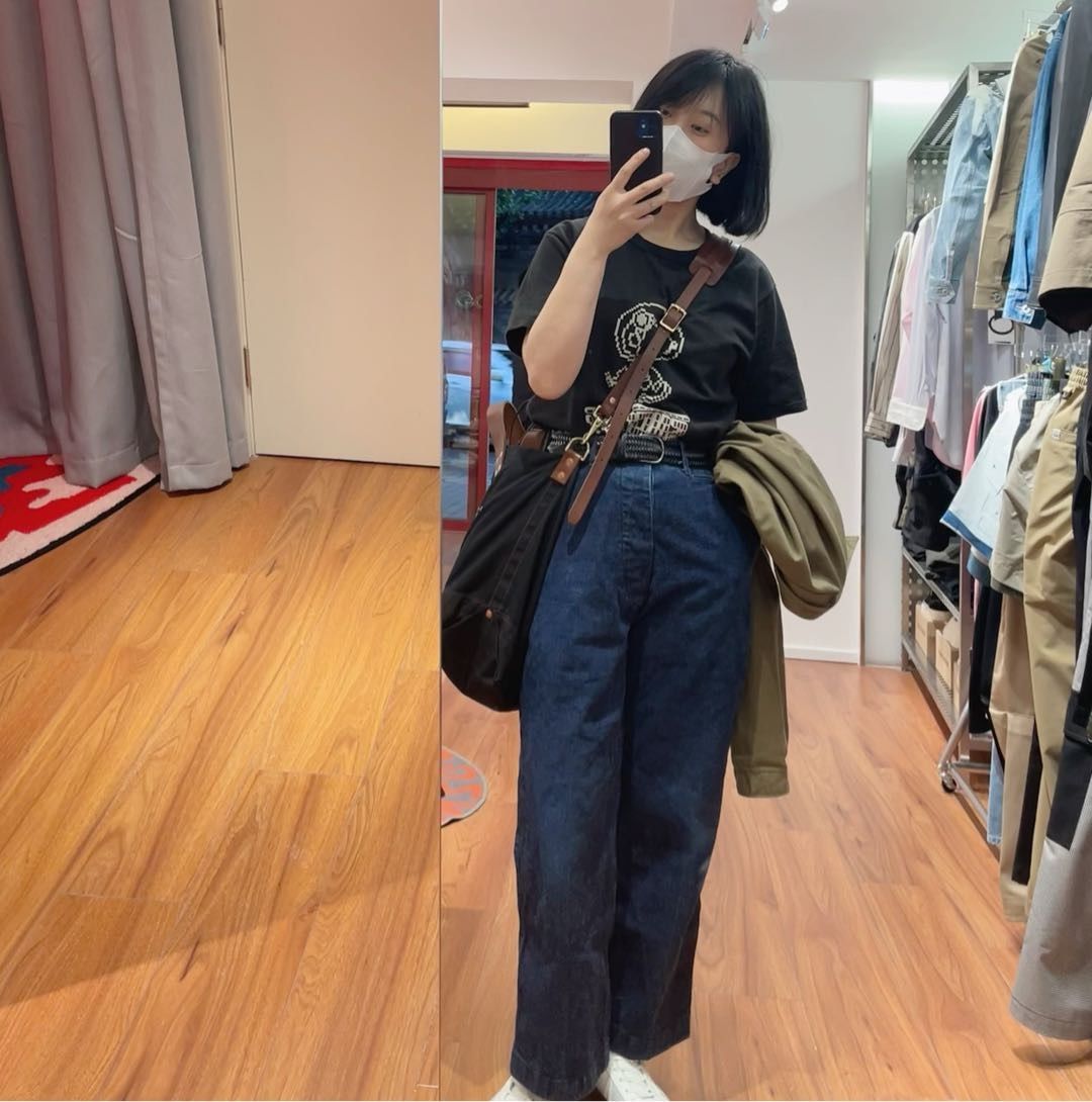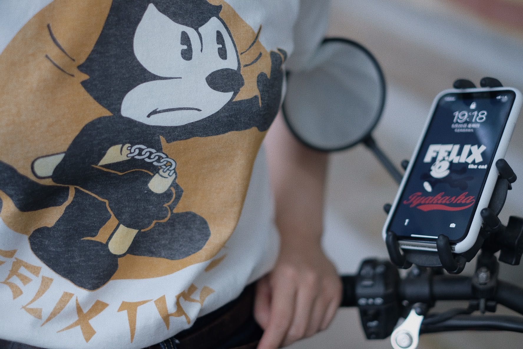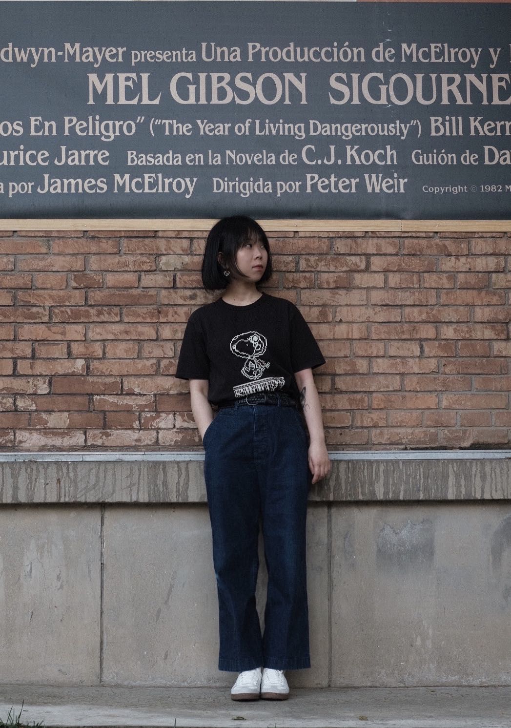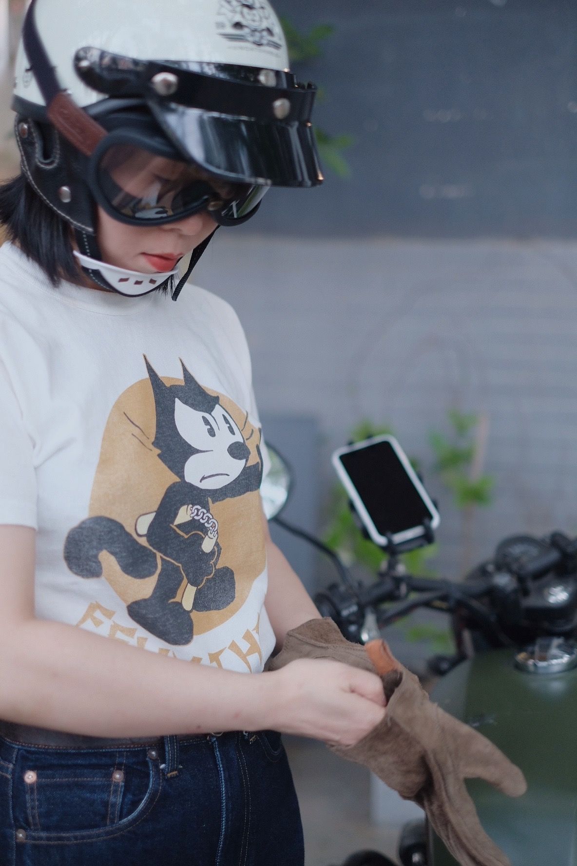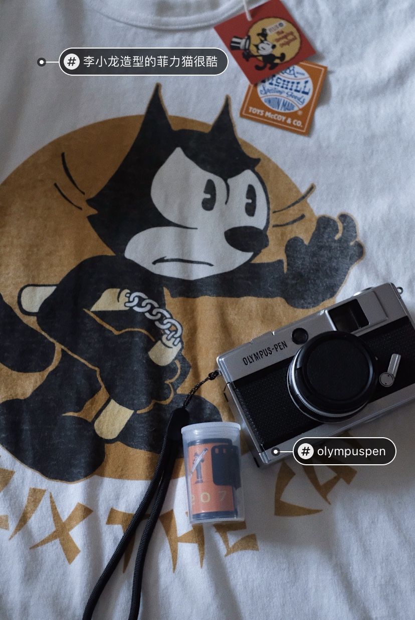 同时她还是一个菲力猫迷,有一件 ToysMcCoy Tee上的印花是李小龙造型的菲力猫,是她在生日月收到的礼物,这件Tee也非常适合她复古的穿搭风格。