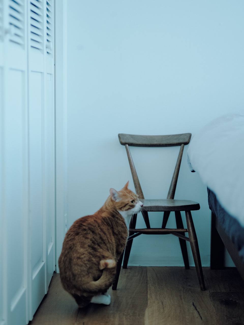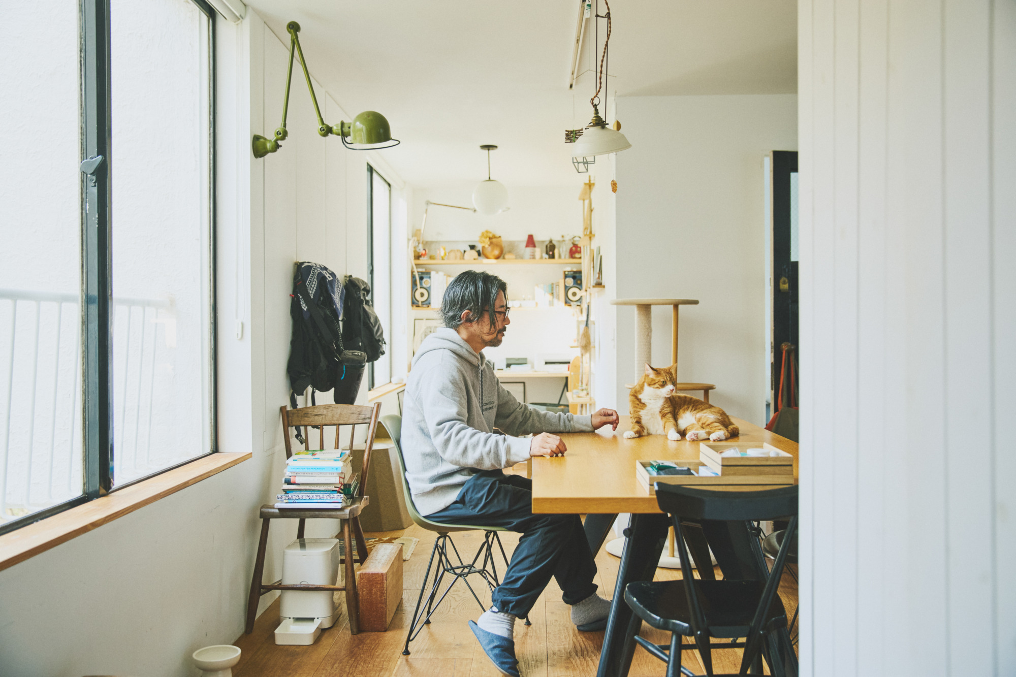 比如家中的餐桌区域是他最爱待的地方,桌体设计美观的同时,使用面积也大,通常在这里办公的时候猫也可以自由活动。此外这款复古灯具也能够根据使用需求去调整不同的角度,可谓非常方便。包括椅子本身还能折叠起来挂靠在墙壁上,打开之后无论是去坐,还是摆放花盆和书籍小物等都能满足。