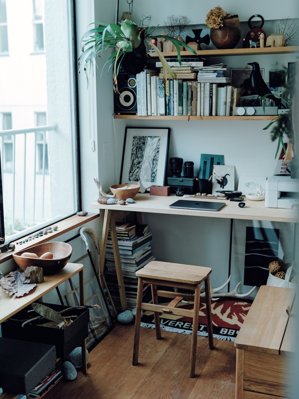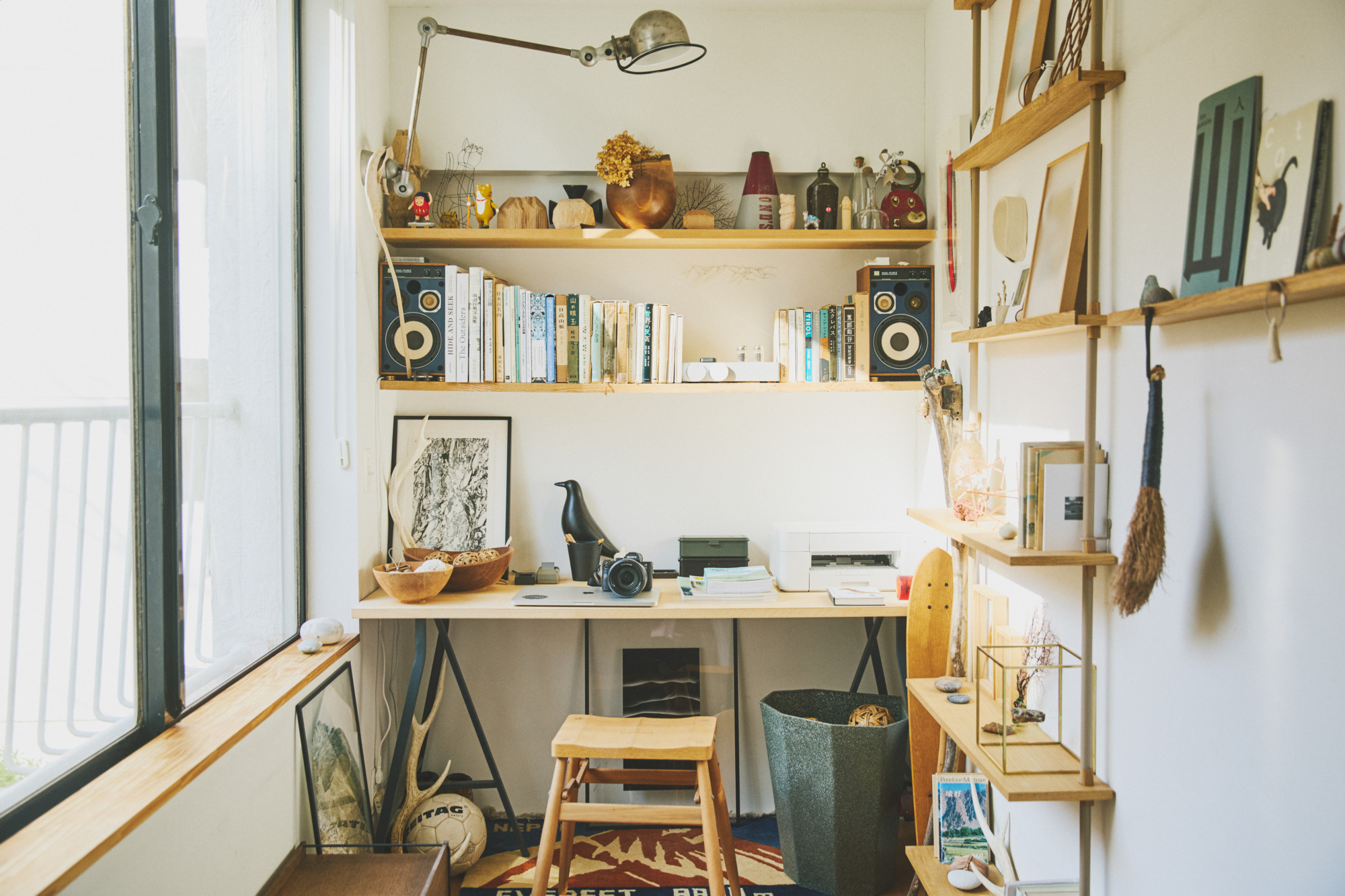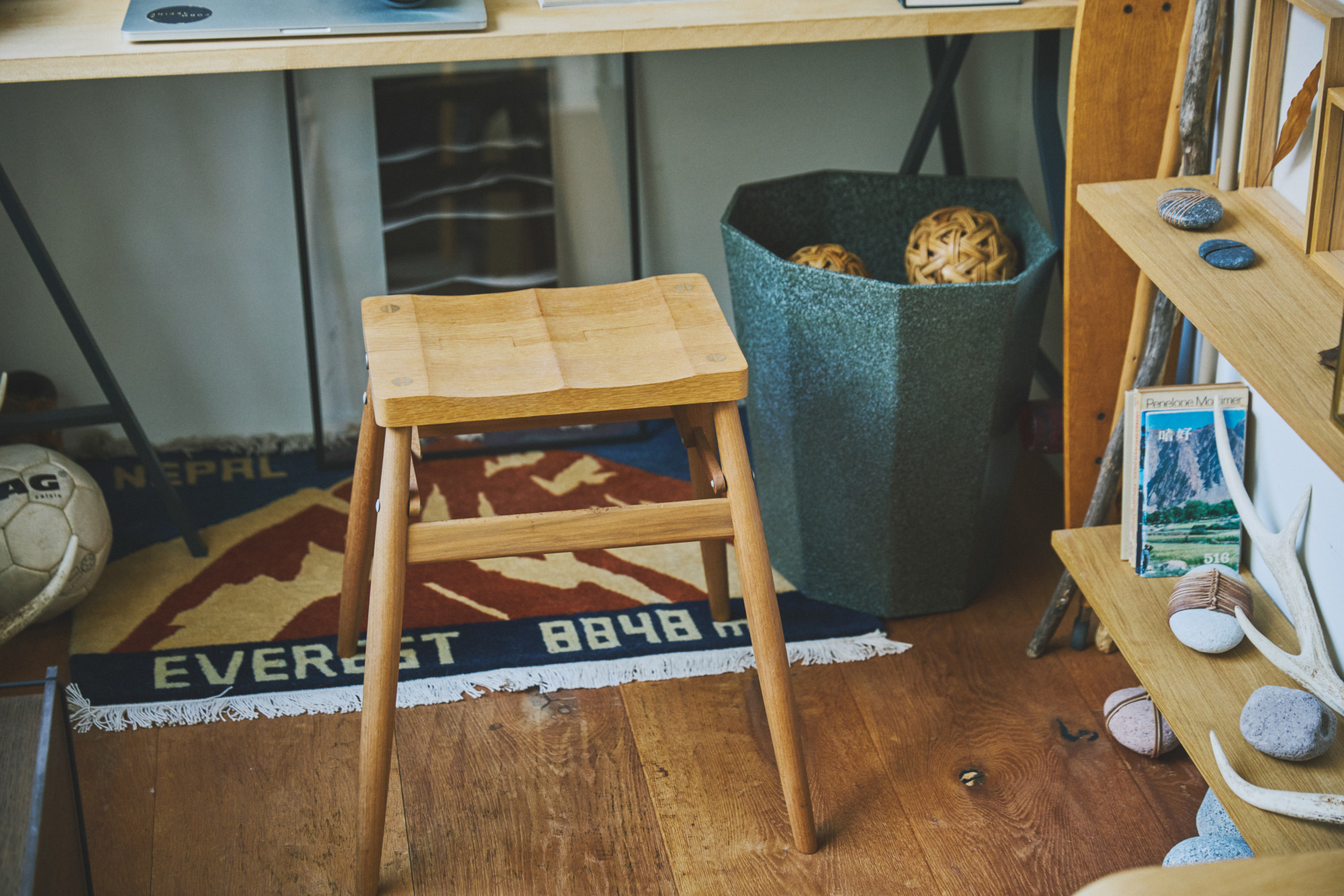 走进办公区域则摆放着很多滝沢時雄喜欢的杂货和书籍,以及山中捡到的石头。前几年他逐渐喜欢上了爬山,并对自然环境产生了浓厚的兴趣,这也影响到了他自身审美和心态的变化。比如之前每到冬天他就觉得很冷,只剩下萧瑟和落叶。但爱上大自然之后,他忽然觉得季节的变化也是美的一部分,即便在很小的环境中只要心态改变,依然能够感受到生活的真谛。