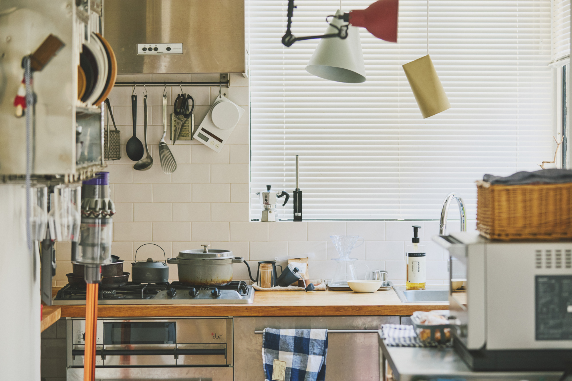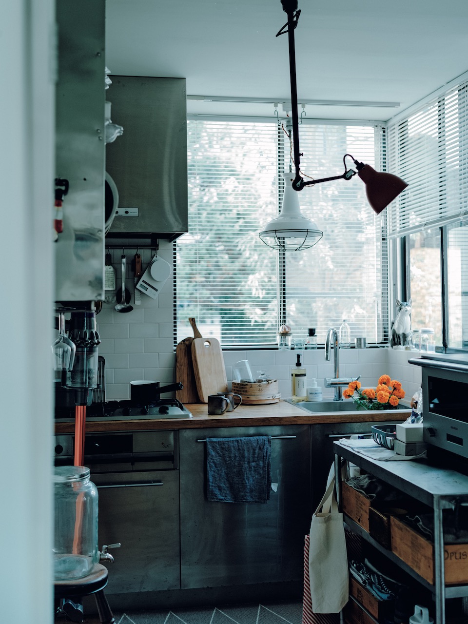 包括厨房区域也从之前的脏乱差变为现在的焕然一新,搭配着从全世界各地购买来的餐盘和厨具,给人一种随时想要料理美食的冲动。即便厨房灯他都选择了可调节的设计,可谓对设计感和功能性的绝不妥协。
