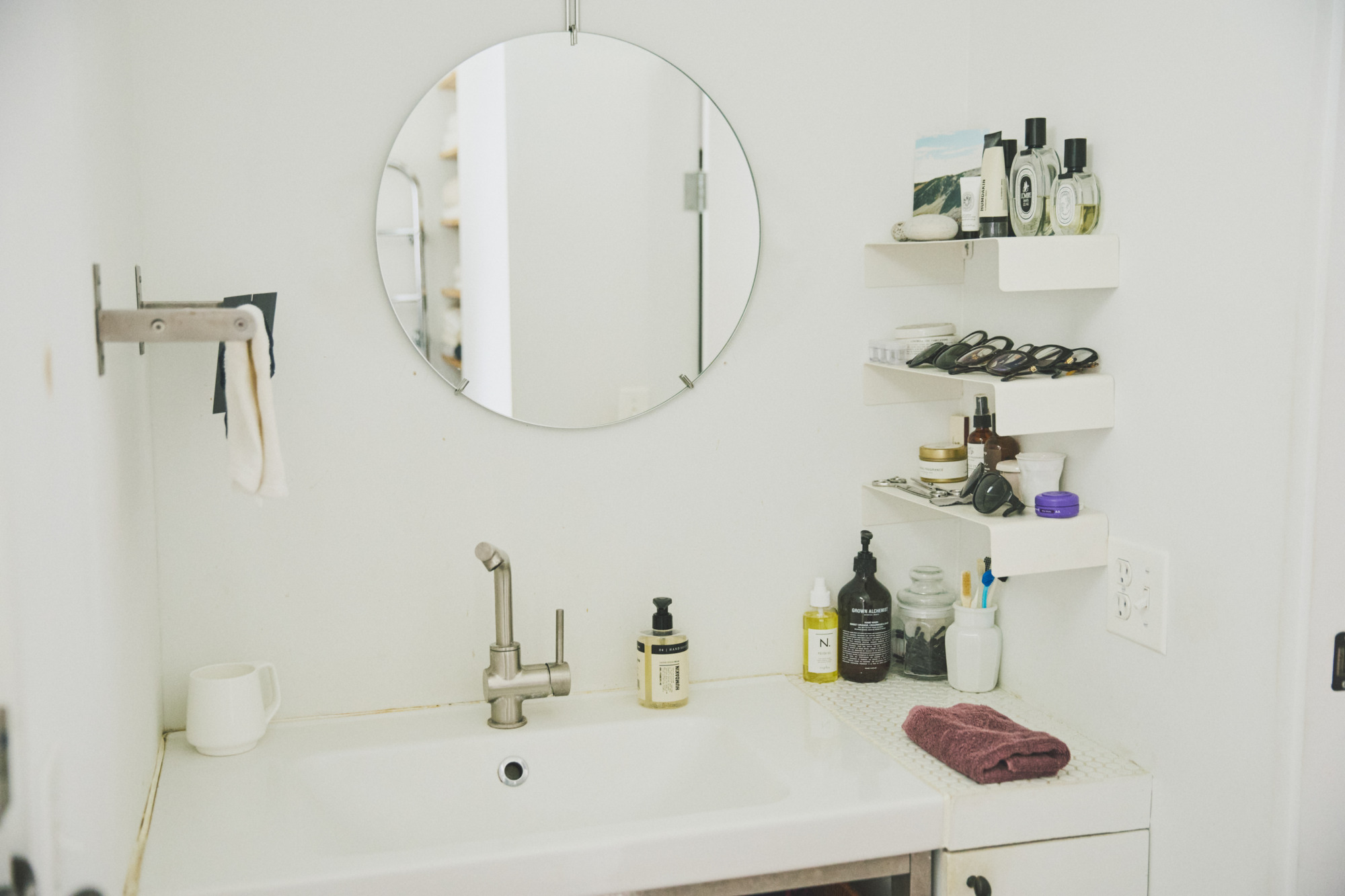洗手间为了视觉统一以及保持明亮感,依然选择了白色主题。其实需要说明的是滝沢時雄家中很多家具其实都是宜家的,并非全部收藏的名家设计。比如洗手间的水槽,旁边放香水和眼镜的架子,简简单单却能呈现出非常独特的审美。