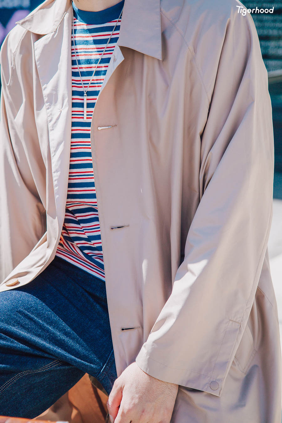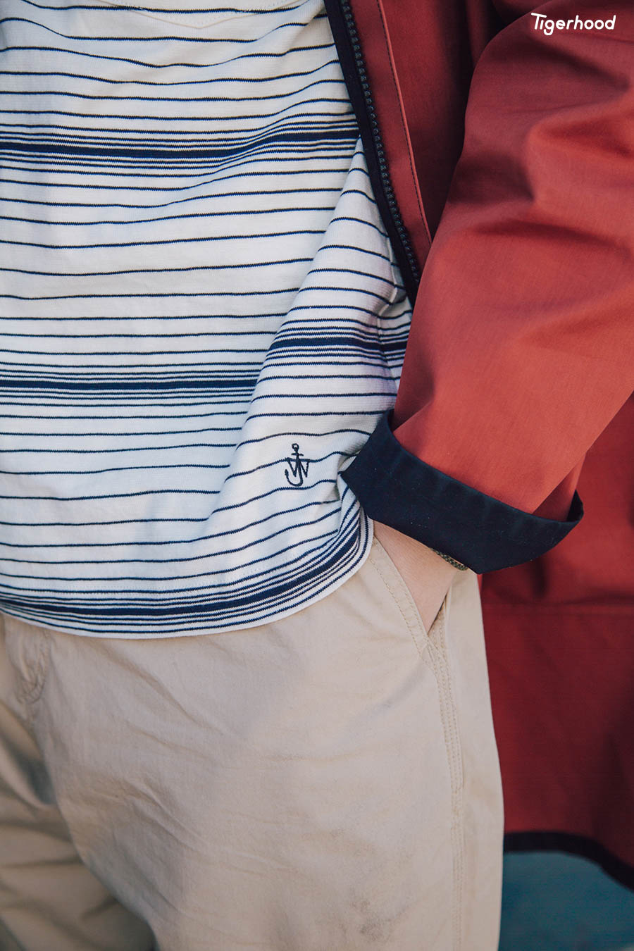 内搭的色彩条纹T恤在配色和设计上,为纯色的外套增添了更多的趣味性,同时与帽子和背包的配色相互呼应。本季全新设计的休闲抽绳长裤,穿着十分方便舒适,搭配起来毫无负担。平时只需将裤脚 Roll Up 起来,展示出你对于球鞋和袜子的专属品位。