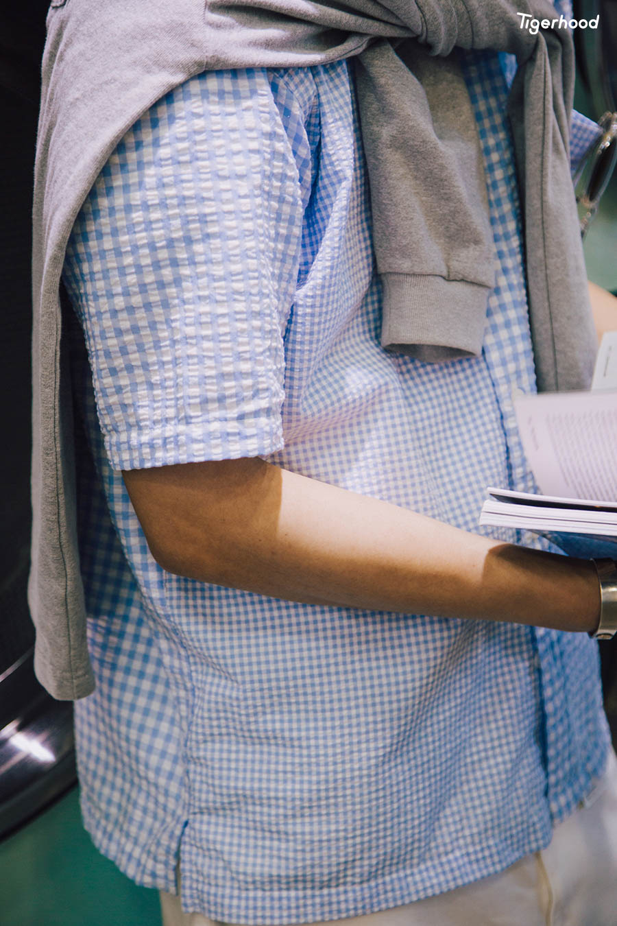 本套假日造型,上身泡泡纱格子衬衫淡蓝的清新配色,以及不对称的格纹设计,搭配夏日专属的泡泡纱面料,营造出全新的时尚质感。而肩膀上的外搭长袖,则可为整体造型增添更多层次,凸显穿搭品位的不俗。