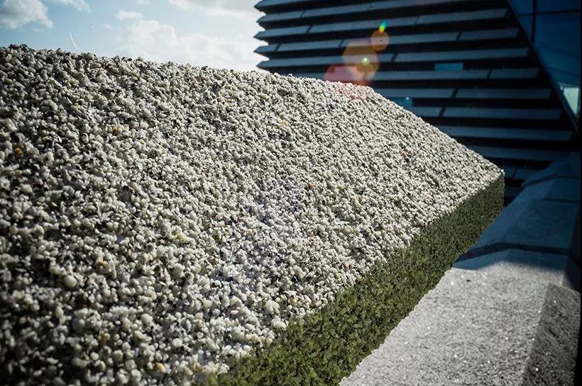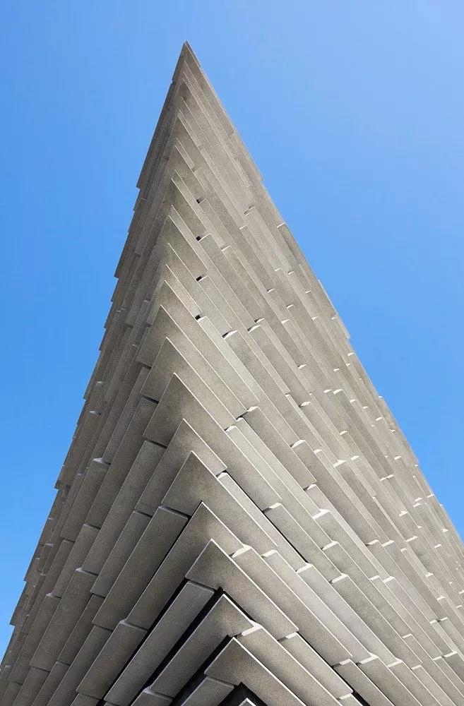外墙面板采用模具铸造,长度可达4米。面板的大小,形状和位置在建筑物上是有变化的,当太阳在博物馆周围移动时,会产生不断变化的阴影图案。整个倾斜的外墙混凝土条板并不是统一的模,这样看起来更加随机性,好像它们被风雨捶打了几个世纪,更加自然。