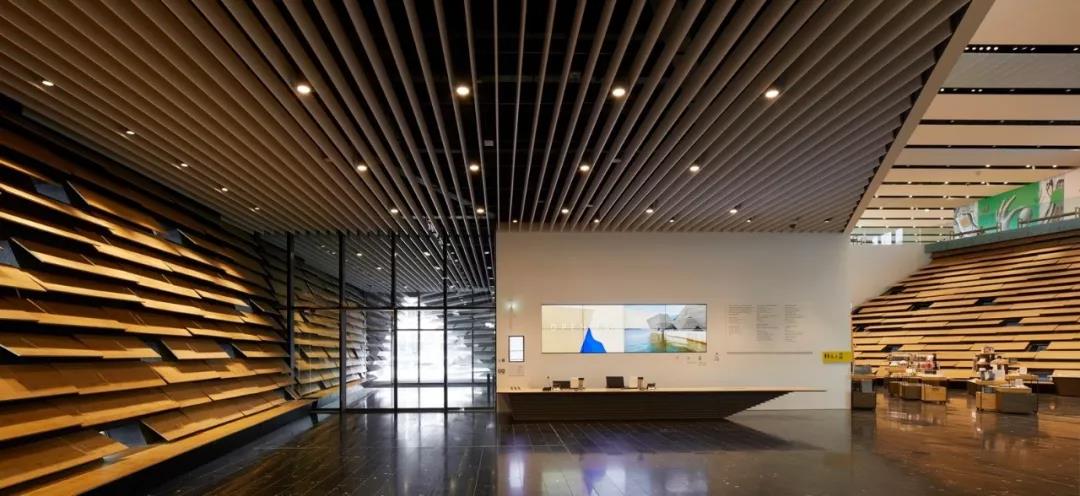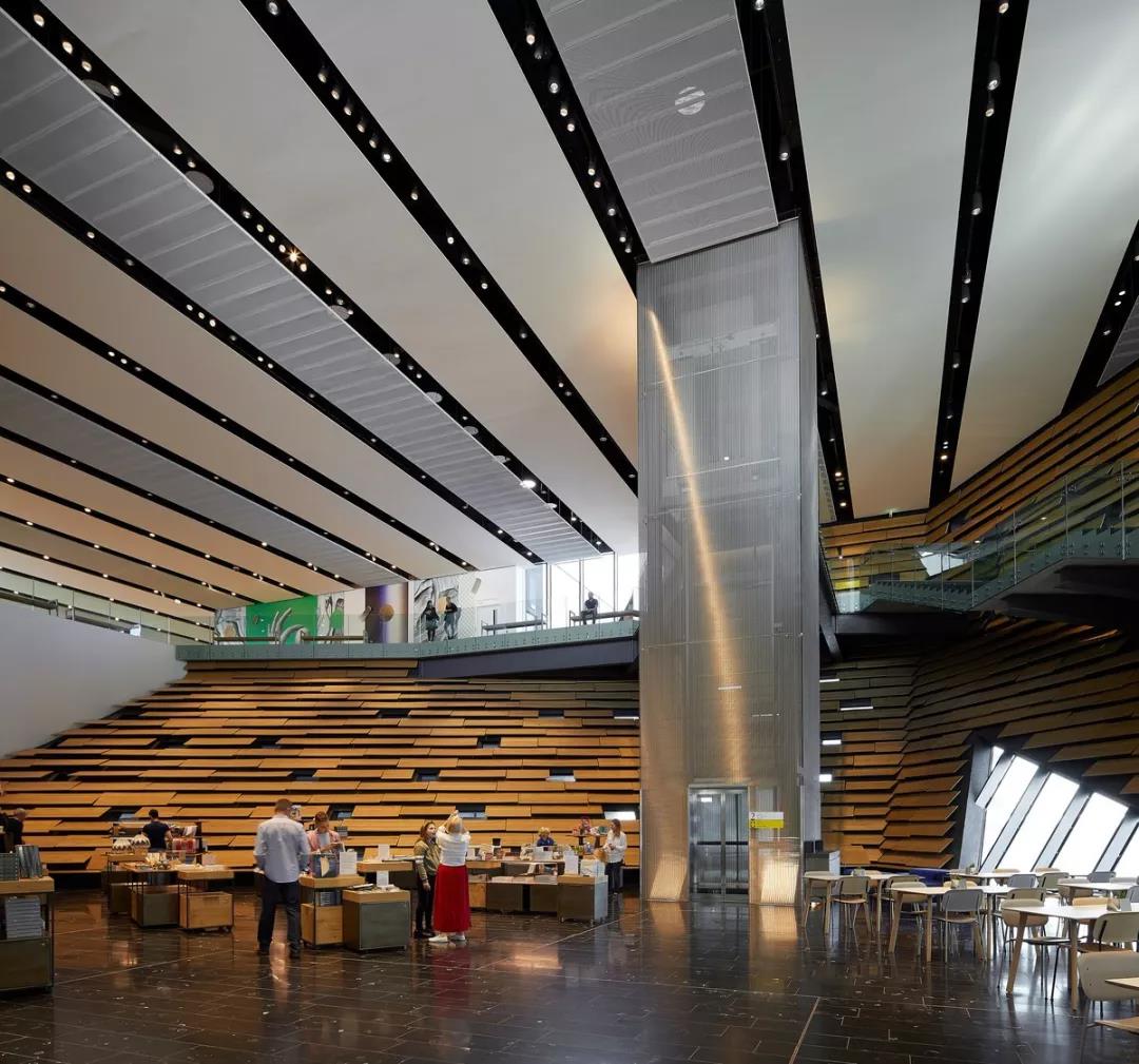 不规则的橡木饰面板衬托在倾斜的内墙上。浅色木与深灰色的爱尔兰石灰石形成鲜明对比。在大厅的地板和楼梯上层层叠叠。不规则的开窗让博物馆内墙表面有着灵动的效果,也在不同的角度看到不一样的景致。墙面的木板的最底下一层则是一个长长的条板,可供人们休憩而座的,视觉上没有一点突兀感。