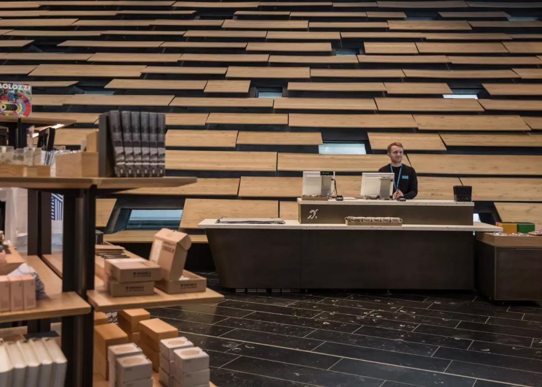 参观者通过一个双层高的主厅进入博物馆,那里有一个咖啡厅和充足的座位。长长的楼梯通向一楼的画廊空间,还有一个书架式的休息区,供游客坐下来阅读。
