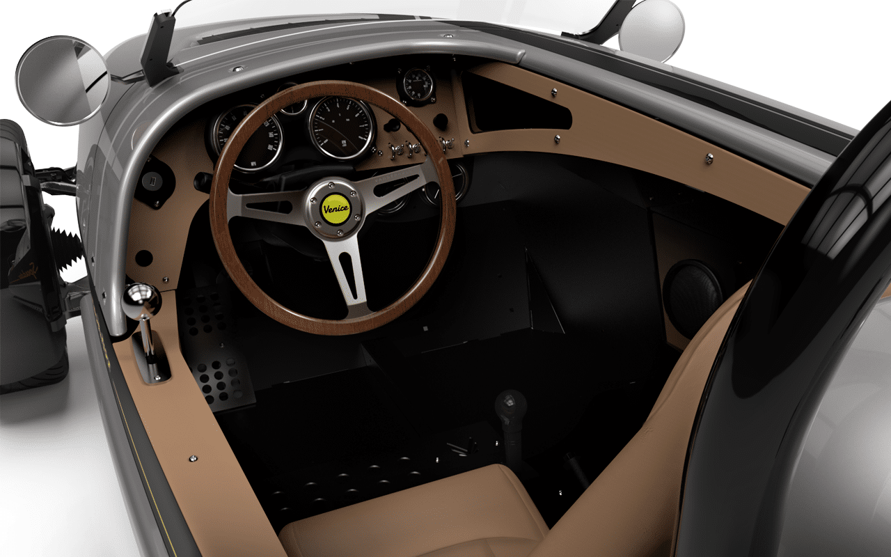 超酷炫的外观搭配着棕色高级皮革的内饰复古气息满满。Vanderhall采用了六速手自一体挡操作模式,最大可达185马力,0到100公里加速仅需4.5秒,最高时速为225km/h。车身设计将70%的重量放在前段,后端为30%以保证最大的牵引力。其次这款车还有灰、蓝、红、黑多种配色可选,另外根据配置不同价格也会稍有浮动。