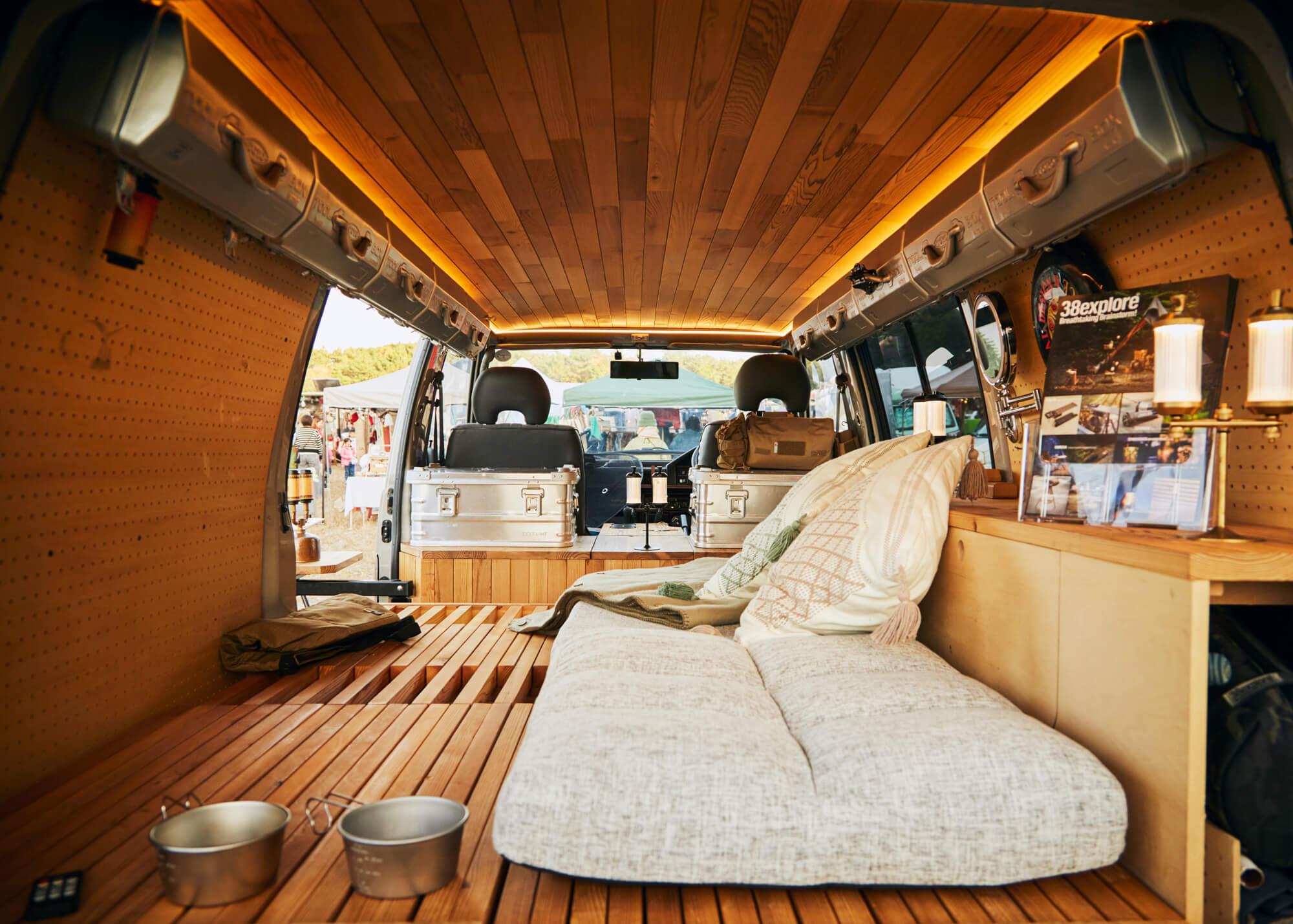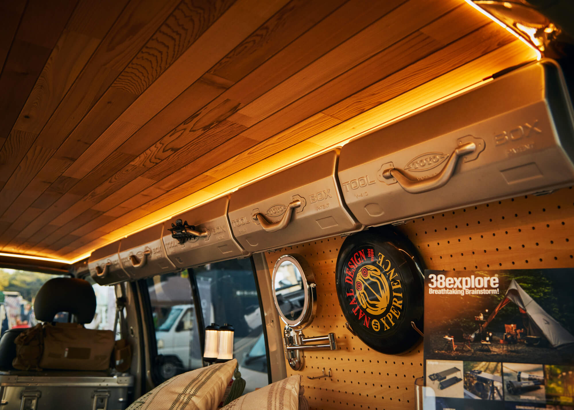 宮川敦所打造的 VAN 保持了风格的一致性,毕竟对他来说比起被车驾驭,不如和车玩在一起,所以他决定自己进行改造。他个人比较喜欢木质的风格,因此直接将地板和天花板都换成了原木材质。此外他去除了床铺和储物空间,只为能够拥有足够的功能区域。宮川敦觉得有限空间其实非常考验一个人的想象力和技术,虽然如今他的风格是这样,但相信之后还会一直改变。