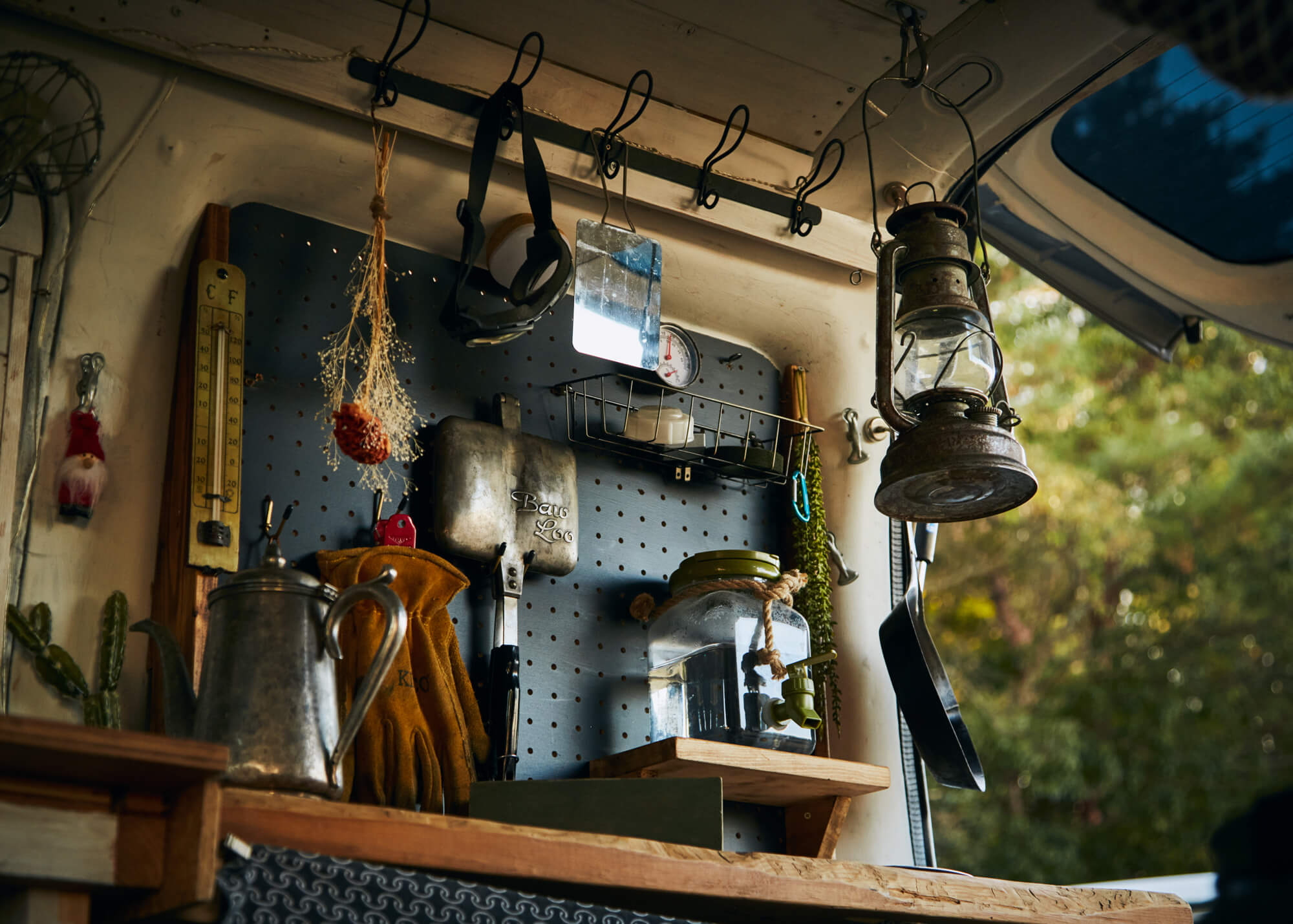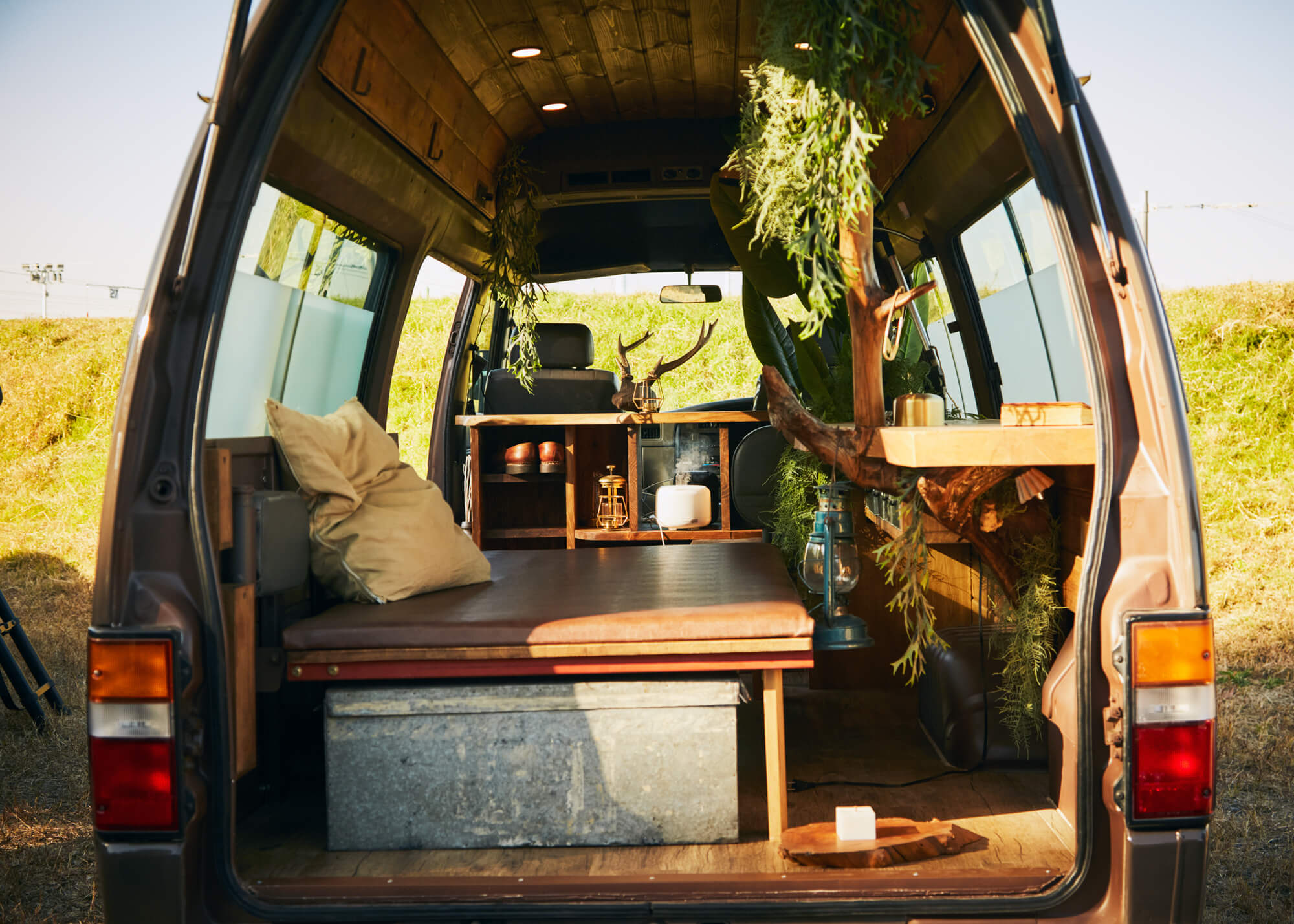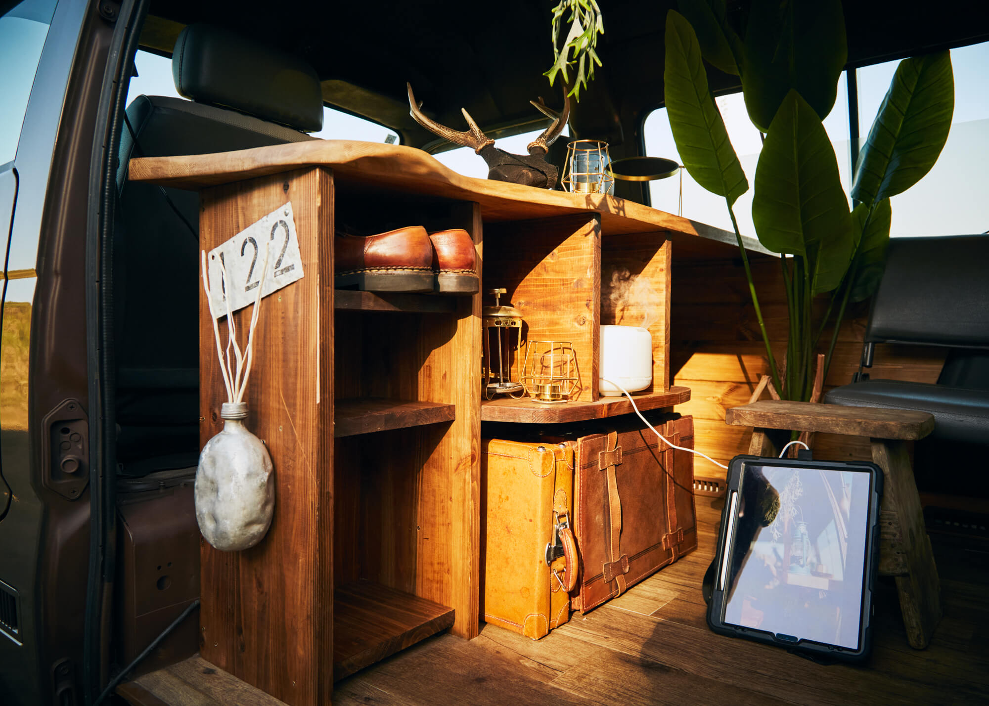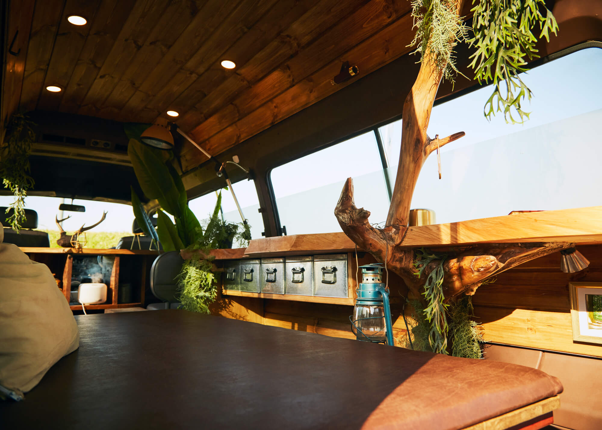 松尾颯本身就在一家房车定制工作室工作,因此对于改装 VAN 可谓是非常专业的存在。他希望人们可以通过 VAN 来改变原本的生活方式,然后去体验不同的人生。首先走进车内映入眼帘的就是各种植物和一棵树状的装置,其次为了融入这种自然感,车内的桌面也是采用水中的浮木进行打造,营造出了一种非常独特的审美体验。松尾颯觉得虽然很多人为了轻便而使用轻量化材料,但他不想为品质感妥协,实木带来的感受绝非塑料所能代替。