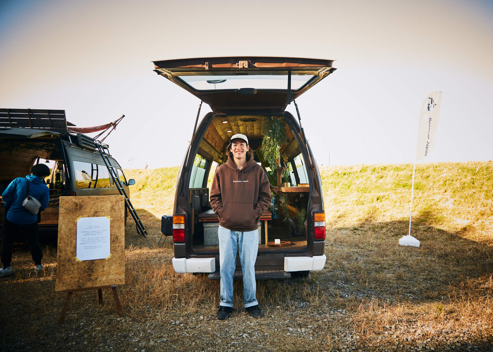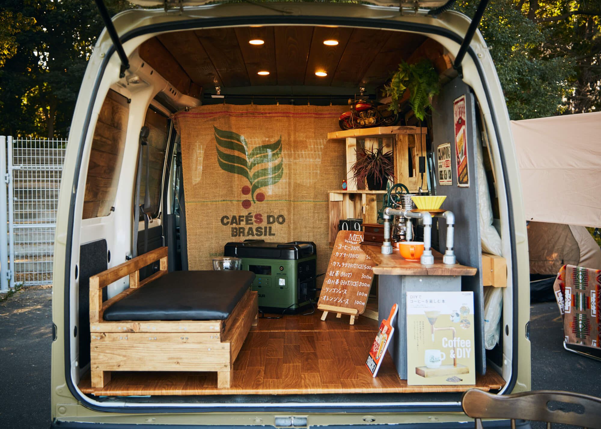 中村勇介的 VAN 是自己专门找改装工作室所定制的,他这些年来一直有个梦想就是打造自己的咖啡厅。后来遇到一位咖啡店主,得知他的想法之后就鼓励他或许也可以在车上实现。随后中村勇介就开始选购车辆、设计草图、找寻改造工厂等。如今改装完毕之后他个人非常满意,平时不但可以冲泡咖啡,而且看似沙发的家具还能打开变为床铺,以满足他远途旅行的梦想。