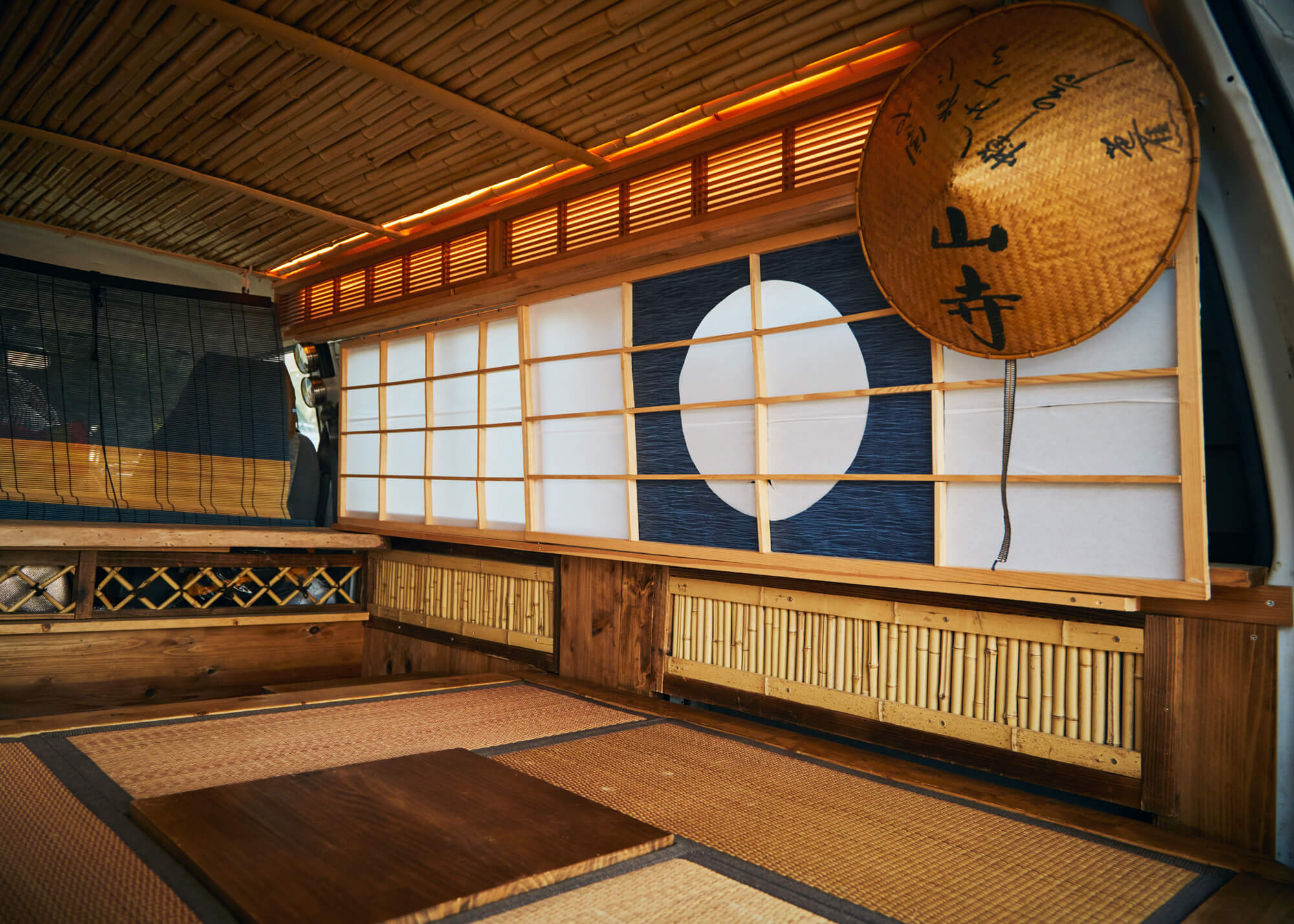 堀口幸二郎在最初改造 VAN 的时候,心里只有一个想法,那就是打造出绝无仅有的风格,最终没想到他竟然把茶室搬进了车内。首先他拆掉了后面所有的座位,全部换成了榻榻米,然后周围用竹子所装饰,包括天花板上也是如此。其次打开地板之后,他还在上面铺满了碎石来模仿庭院。后来因为这辆车过于特殊引起了很多人的好奇,所以平时在路上旅行时也经常能够认识到新朋友,这让他非常开心。