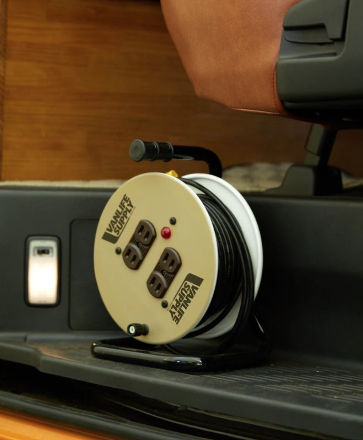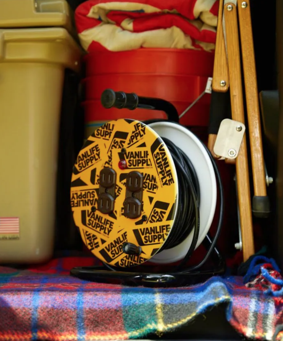 可能让大家意想不到的是,连户外卷线器这种装备 VANLIFESUPPLY 也有设计。整个卷线器内的电线共10米长,并提供了4个充电位置可供使用。即便不在户外,日常在车库或者花园中也可以进行使用。