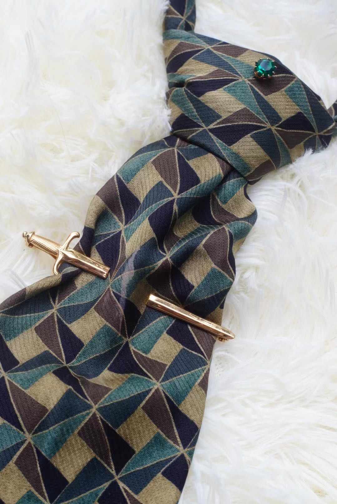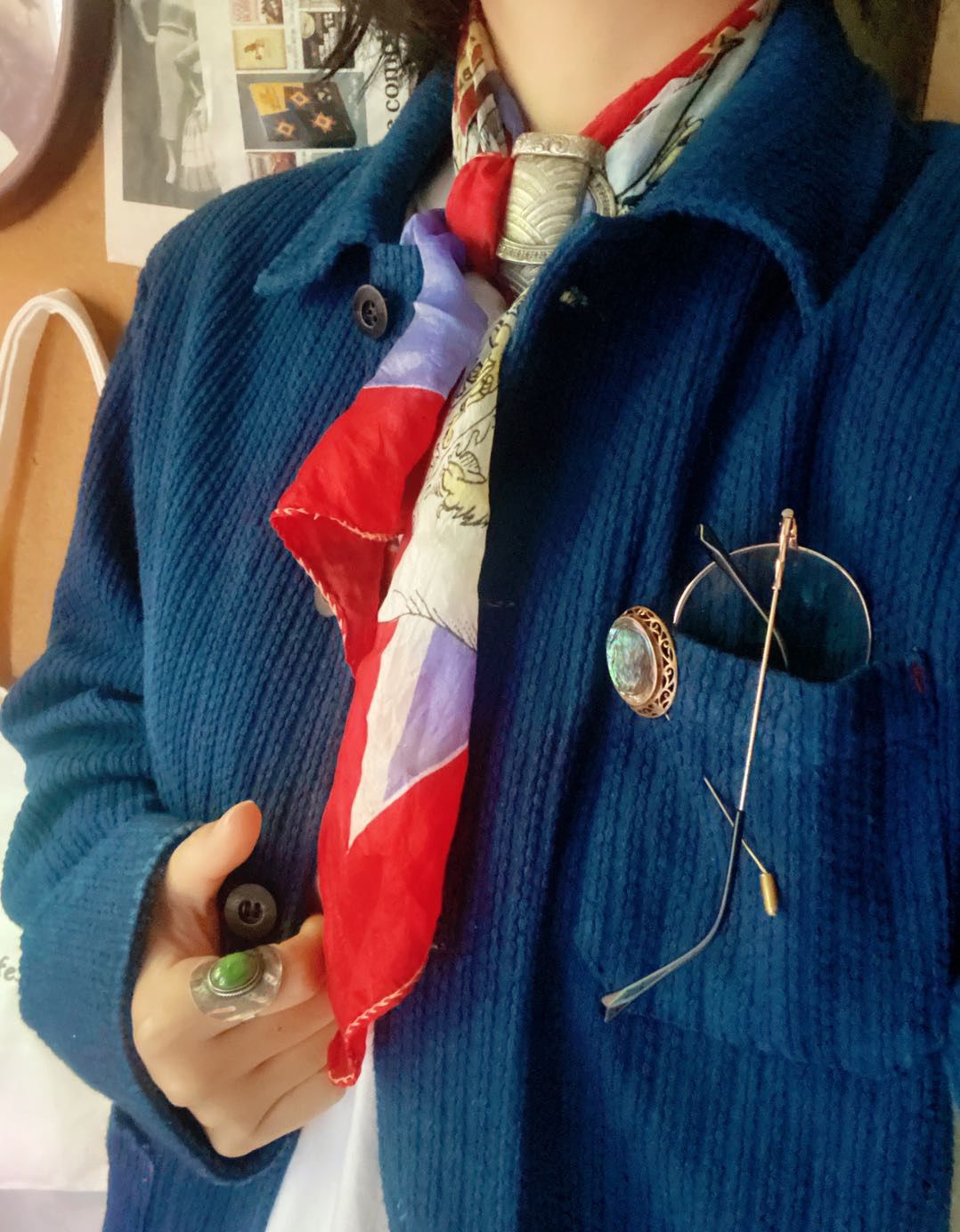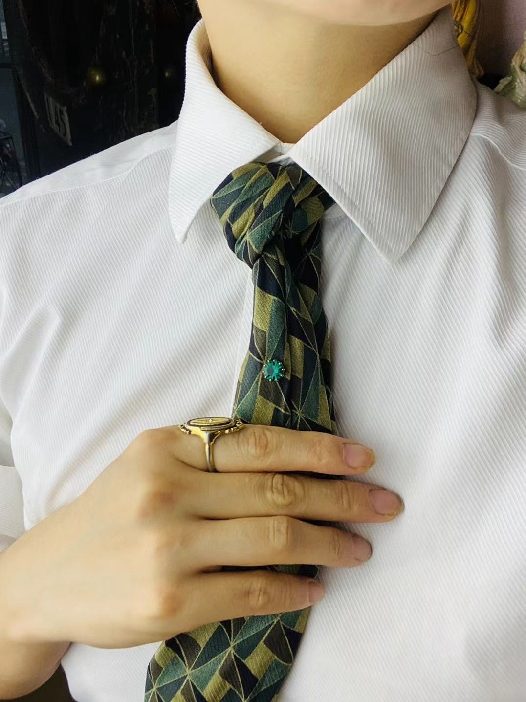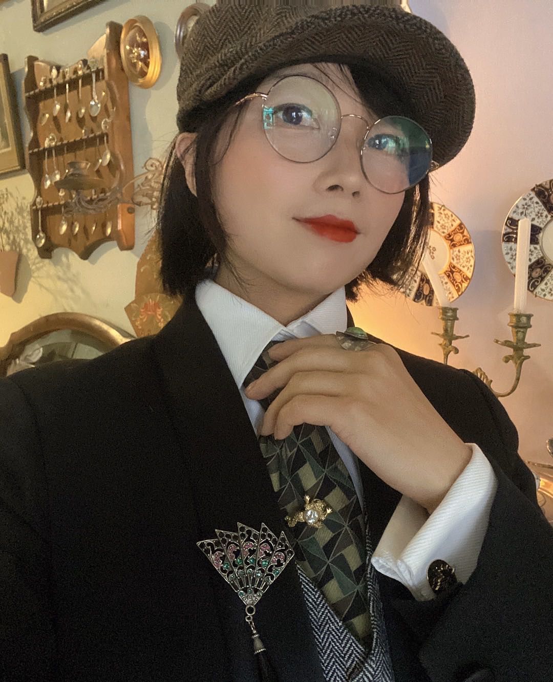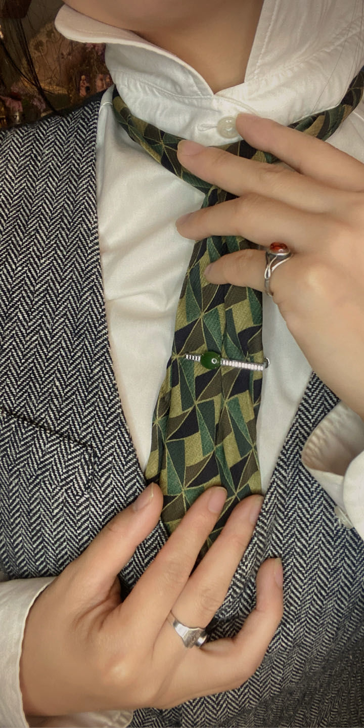 在她的穿搭里,配饰是很重要的一环,也是很好凸显“绅士”、精致的单品,出场率最多的大概是拇指戒,她称自己是“最会戴拇指戒的人”。除了拇指戒之外,领针、胸针和袖口也是她常常佩戴的配饰单品,更复古一点的马甲链和照片吊坠也偶尔会出现在搭配中。虽然有时会有很多配饰单品的堆叠,但是不会很杂乱,反而会让这些配饰更好地服务整体的穿搭。
