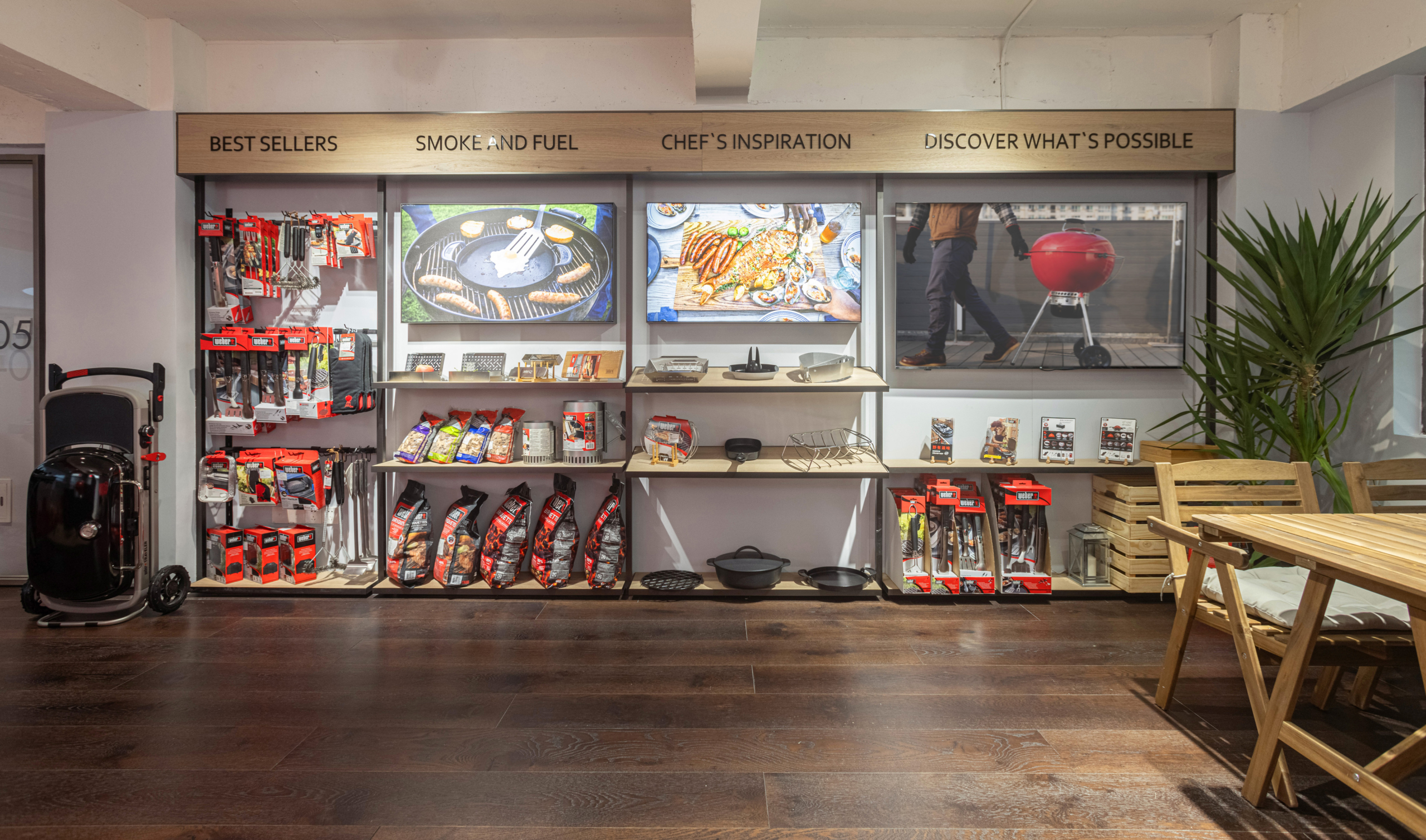 Weber威焙展厅内各类BBQ配件陈列区域,从畅销的常用BBQ配件,烧烤夹、酱料刷、防烫手套、清洁刷等以及炭烤所需要的天然有机炭和各种不同香气的烟熏木块等。更有针对不同食材所设计的烤架,烤锅等B BQ工具;全方位升级BBQ体验。