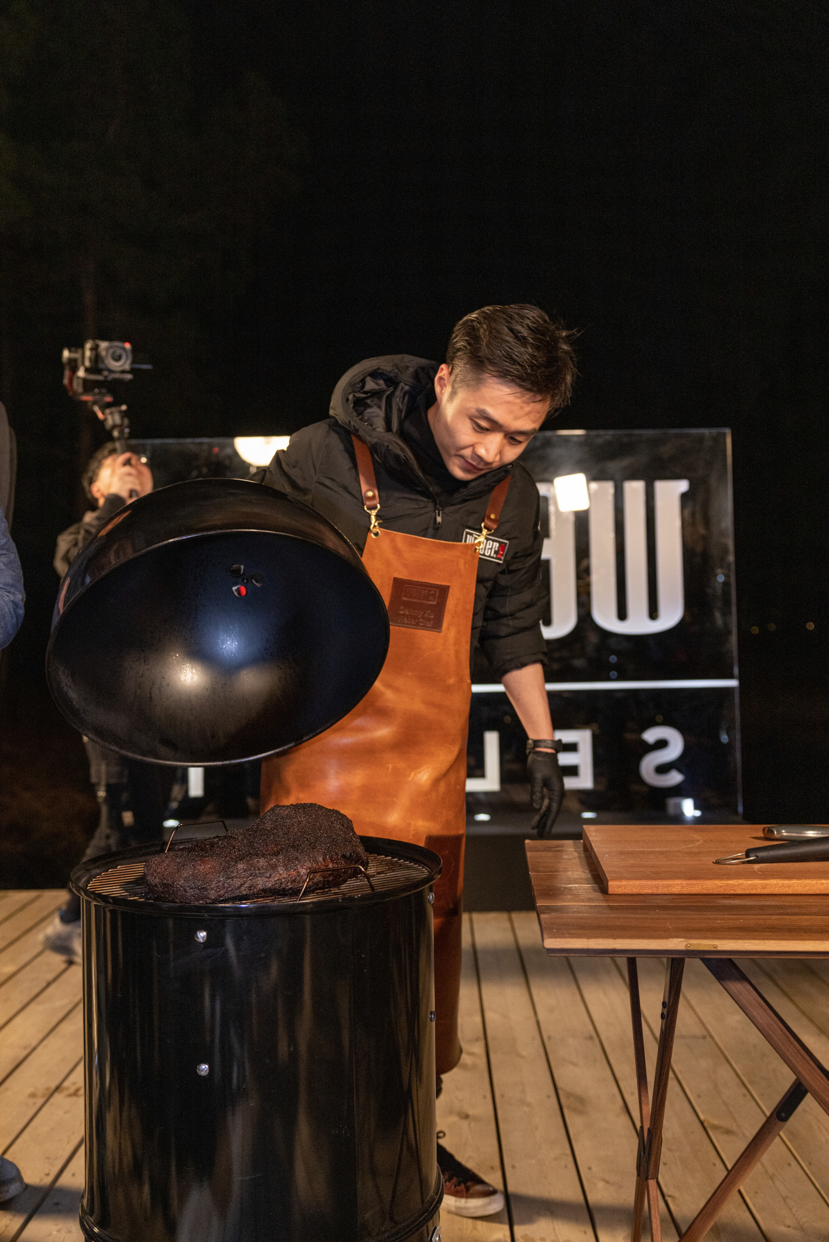 傍晚,Weber威焙中国首席主厨Danny Xu亲自带领嘉宾在荒野厨房餐厅一起进行BBQ体验。伴随着红韵Kettle炭火的滋滋声,烤全鸡的香气逐渐萦绕于营帐间;等待美味的间隙,另一边Traveler探享家也开始烹饪肋眼牛排、鸡翅、虾、等食材。美味出炉后,便展开了一场激烈的“摆盘比赛”,将“色”“香”“味”的灵感形态各异地呈现在餐盘之中,最后的神秘压轴大菜便是用Smokey Mountain烤炉焖烤10个小时的慢烤和牛牛胸肉,一出场便惊艳四座,每个人都是BBQ大师。当篝火冉冉升起,现场来宾围坐一块,相互畅谈、篝火晚会的其乐融融与松林湖的粼粼夜色相得益彰。在欢笑,分享美味的氛围中一场别具一格的户外体验也就此进入尾声。