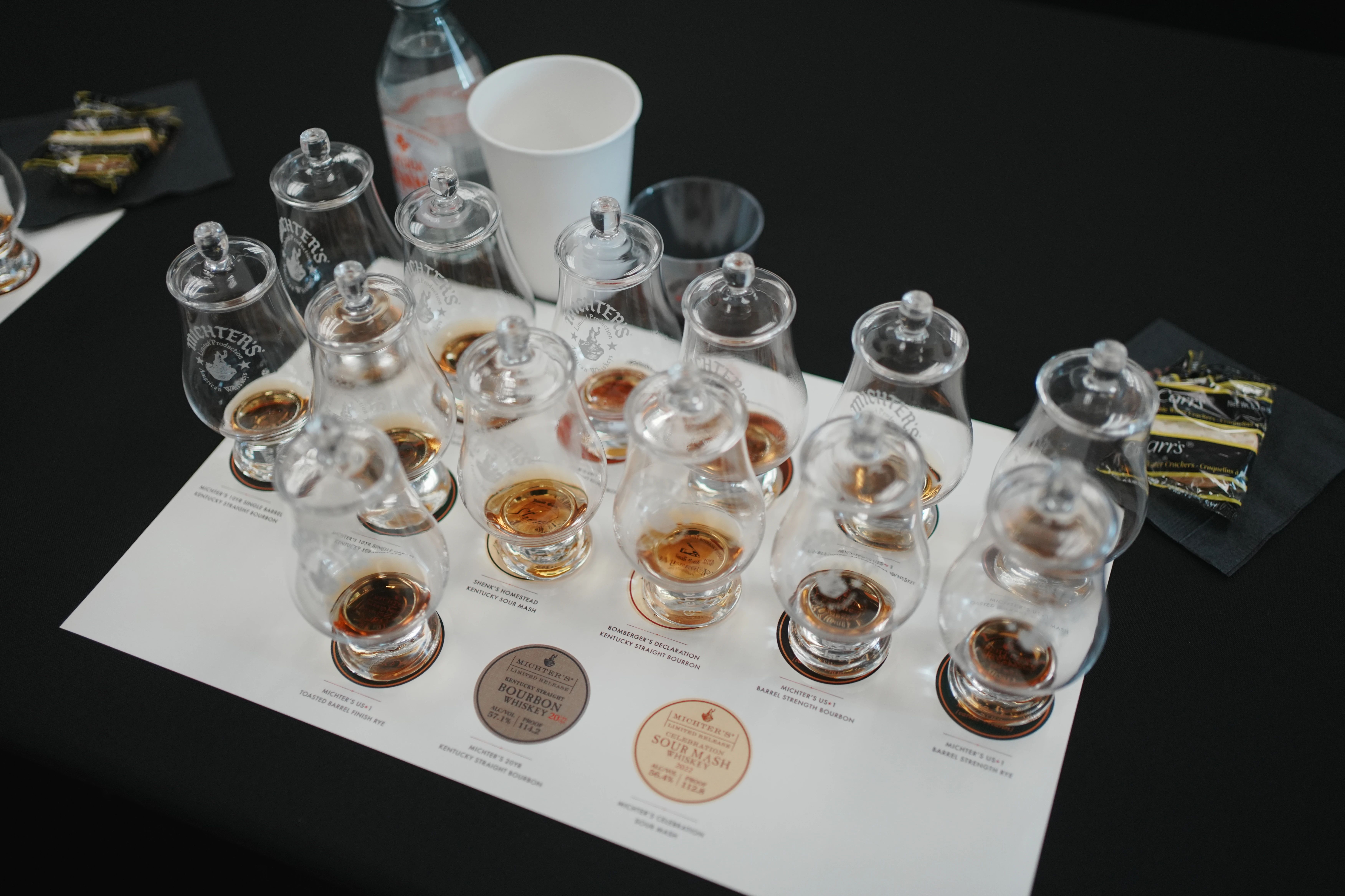 除了常见的US·1系列、10年波本和黑麦,酒厂还准备了包含肯塔基州限定酒款US·1强波本,不久前刚刚释出的US·1烤桶黑麦,多款高年份以及代表美国威士忌最高调和水准、单杯高达一万多的“庆典酸麦芽”在内的15款酒(加上在酒厂喝的原酒、新酒,前前后后共18款)。