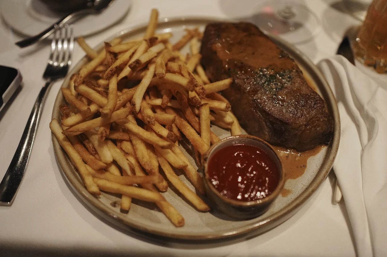 肉来自牛的前腰脊部,5分的熟度,让肉质达到刚刚好的软嫩又带嚼劲,经典的胡椒酱汁,从原料到烹饪到调味,挑不出任何毛病,搭配的细薯条也炸得干香好味。