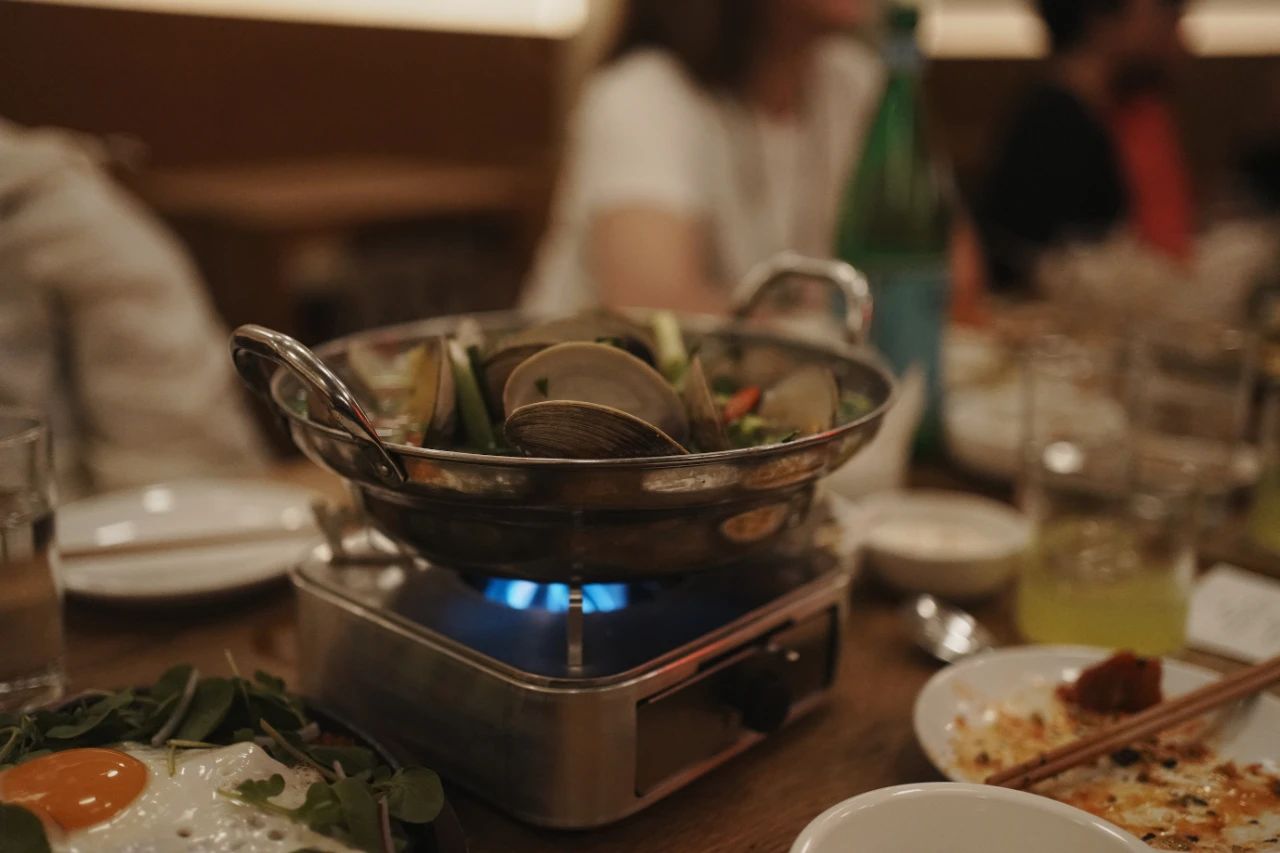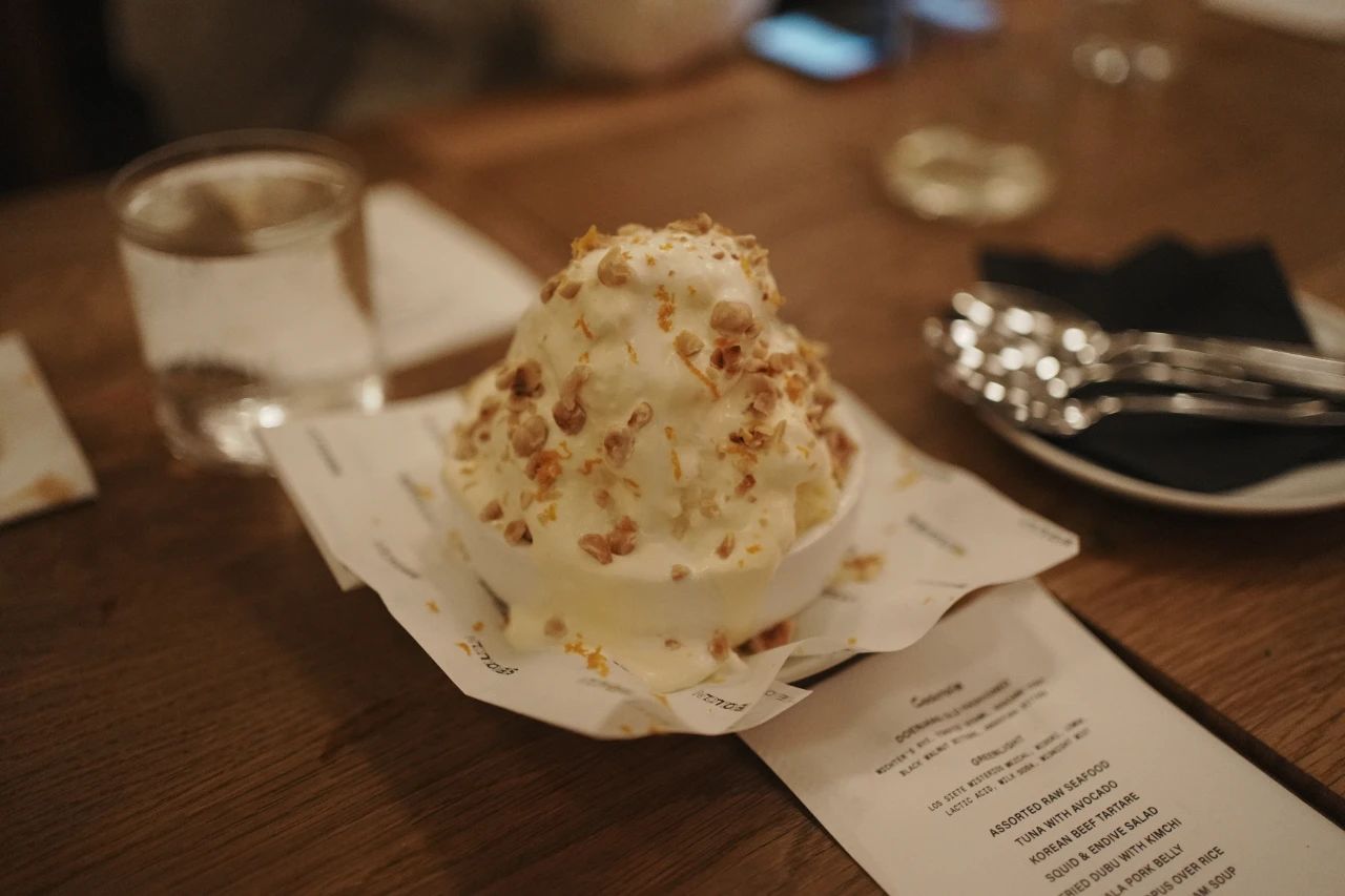 剩下的每道菜,我都很满意:鲜美的鱼生拼盘,开胃下酒的韩式牛肉塔塔,泡菜配炸豆腐,酱汁浓郁的五花肉,蘸蜂蜜吃的甜辣油炸土豆,刚好辣到舌尖微痛的热乎蛤蜊汤,最后收尾是香甜的香蕉刨冰……绝了绝了。