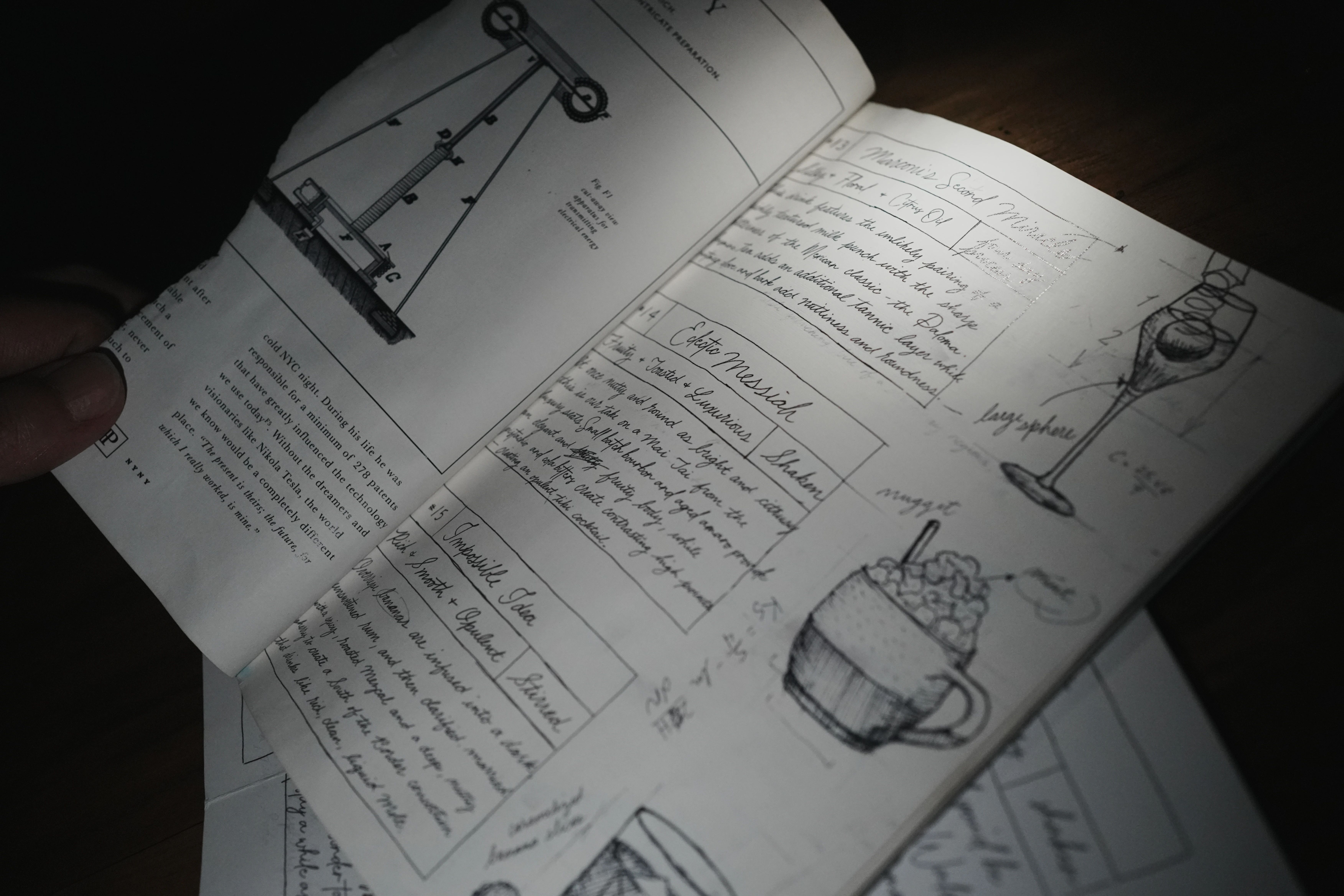 手绘的酒单故意做得乱糟糟的,手写体+素描像极了物理学家的草稿本,什么AC/DC,current,coil,motor……咋一看还真的不太好懂。
