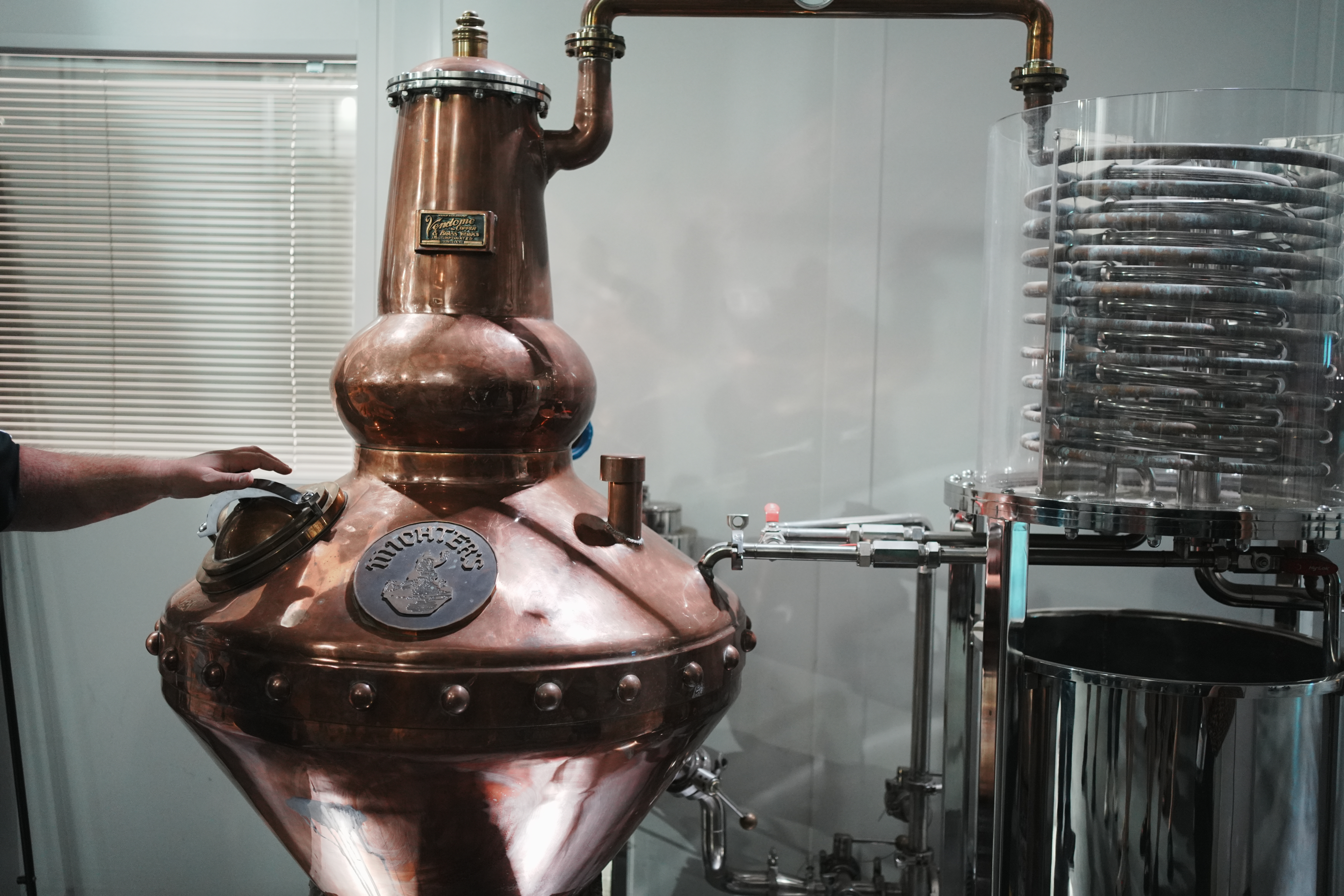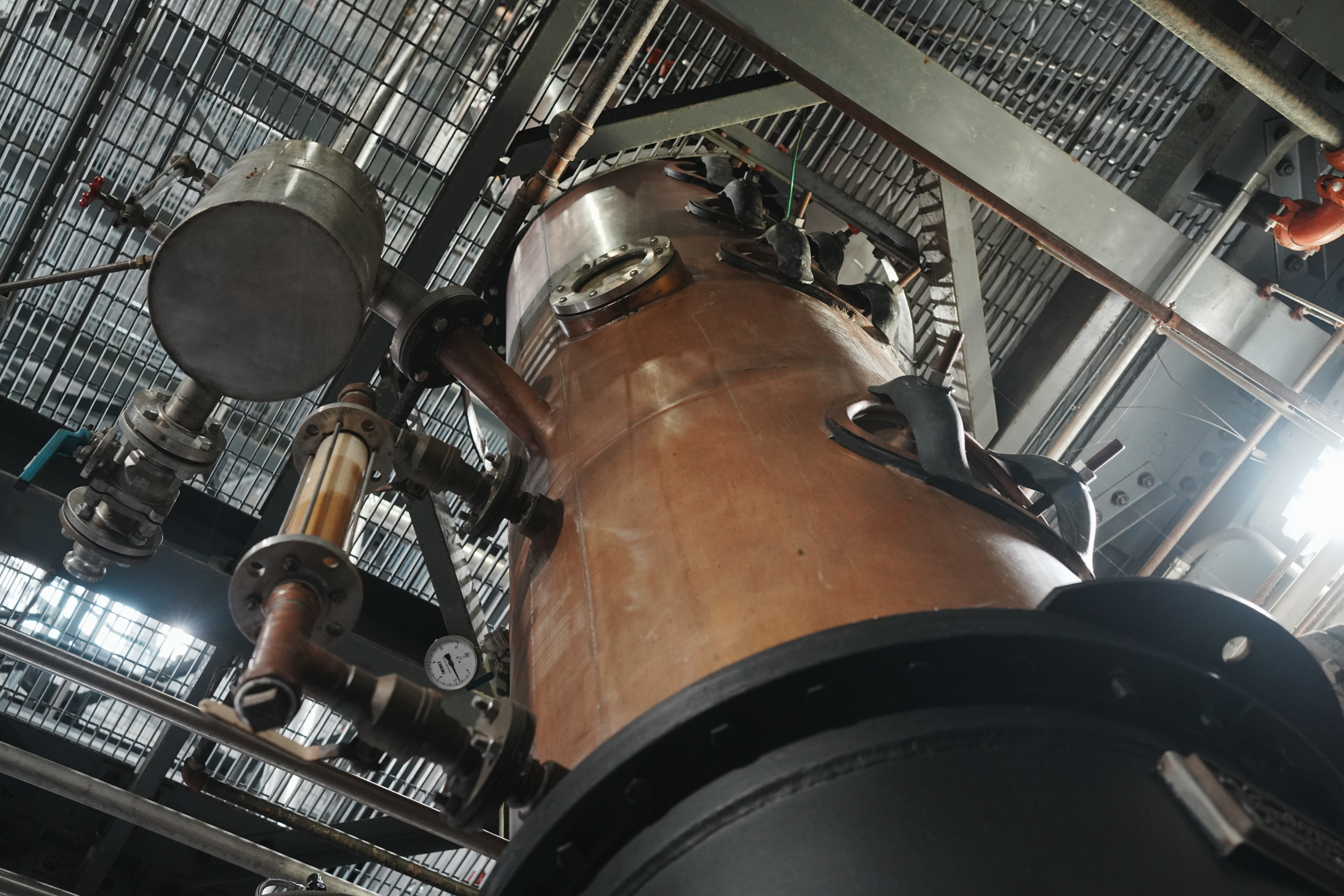 最为灵魂的酩帝诗蒸馏室里,有重金打造的塔式与壶式两座纯铜蒸馏器,造价和养护成本都比不锈钢高很多。