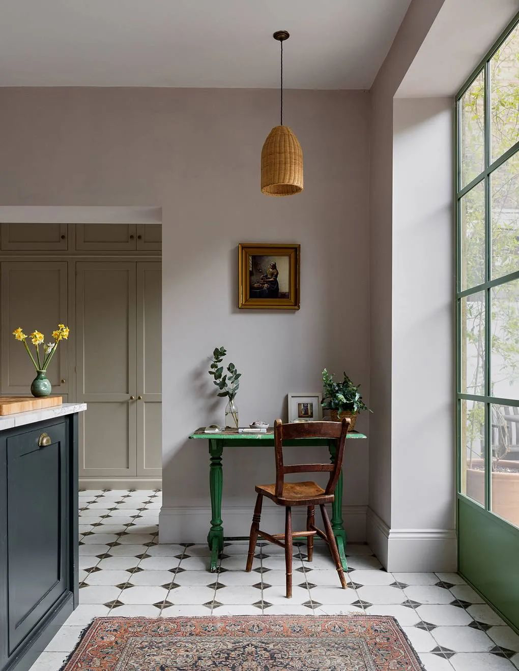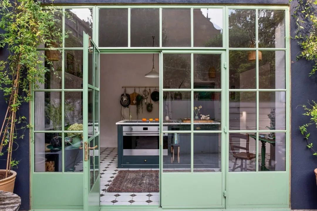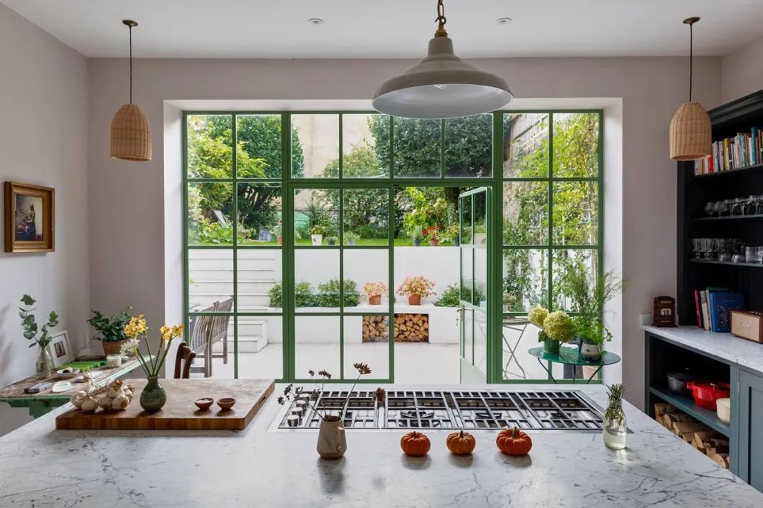 对于业主Chris和Jolene来说,厨房是最值得改造的一个区域,因为它原本只有两扇狭小的窗户。夫妻俩把厨房正对花园的后墙改装成了一扇绿色落地玻璃窗,他们放弃了原有的黑色和灰色。从改装结果来看,这扇玻璃窗成为了房子最引人注目的亮点,它甚至激起了Chris为厨房取名的兴趣:“从今天起,厨房就叫:Wes Anderson meets Provence”。