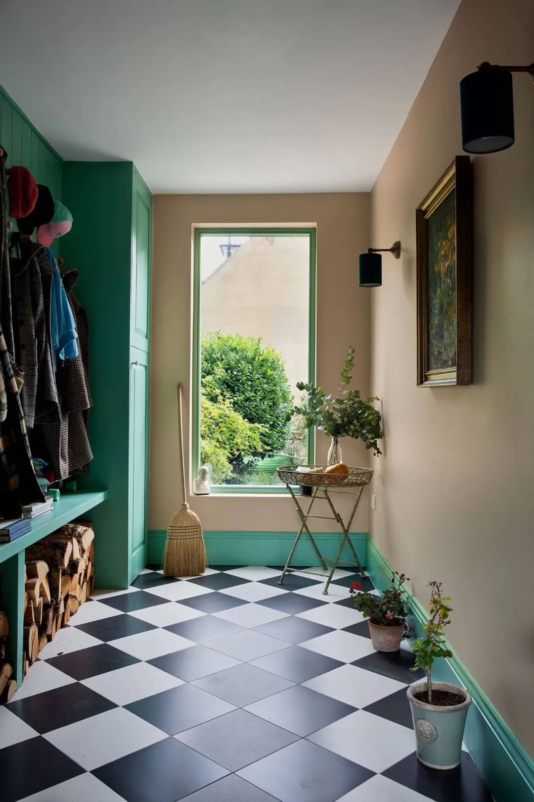 厨房背后的小杂物室被一堵墙隔开,这里尽量保留了房子一楼本来的分区。杂物室的地面由黑白两色的瓷砖拼贴而成,它打破了墙面和天花板的“规则感”。
